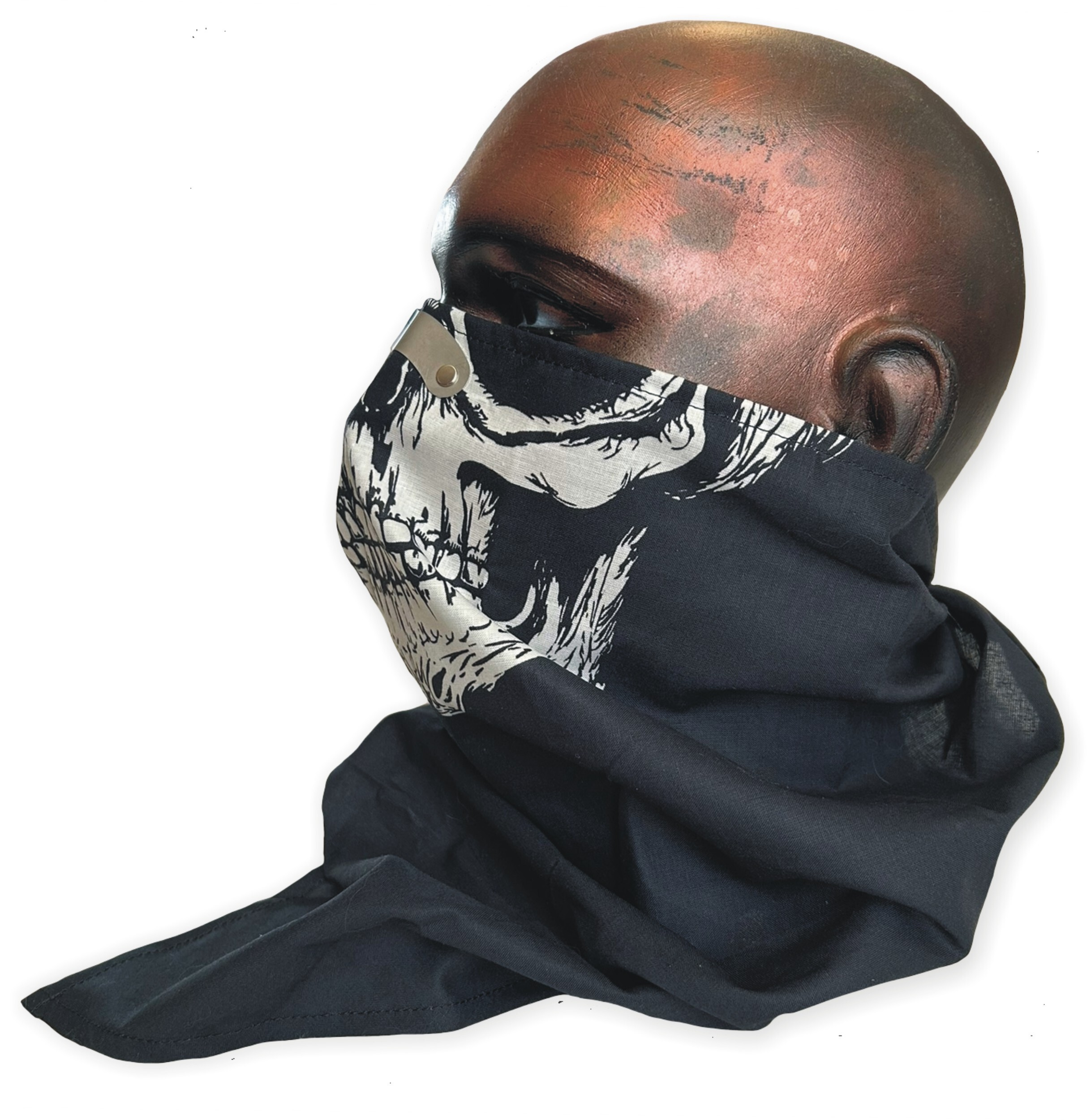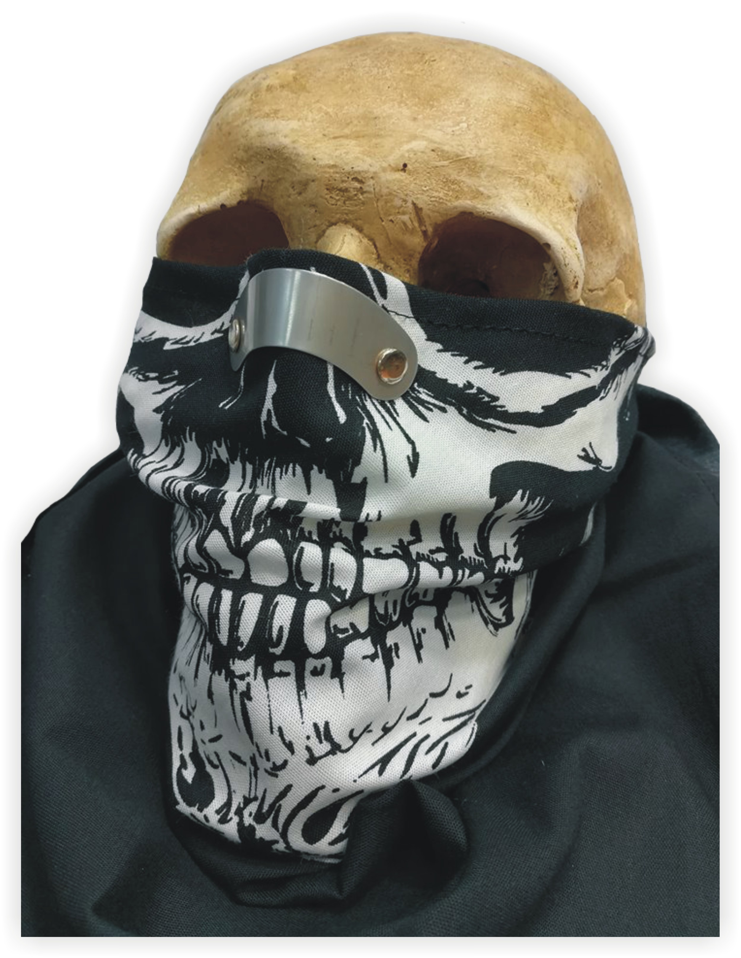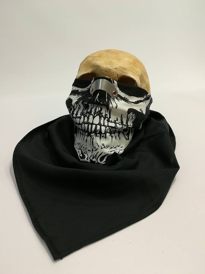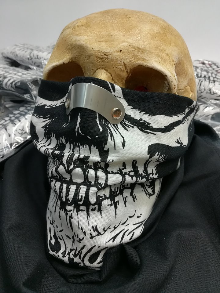 Velký trojúhelníkový šátek s kovovým skřipcem na nos a s jedinečným motivem. Díky kovovému skřipci, který lze vytvarovat podle tvaru nosu, šátek drží na obličeji i při vyšších rychlostech. Díky materiálu a technologii tisku je prodyšný, ale přitom chrání obličej před větrem, hmyzem ap. Šátek na obličej/hlavu upevňujeme zavázáním cípů šátku. Vhodný doplněk k otevřeným helmám.