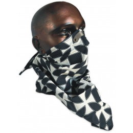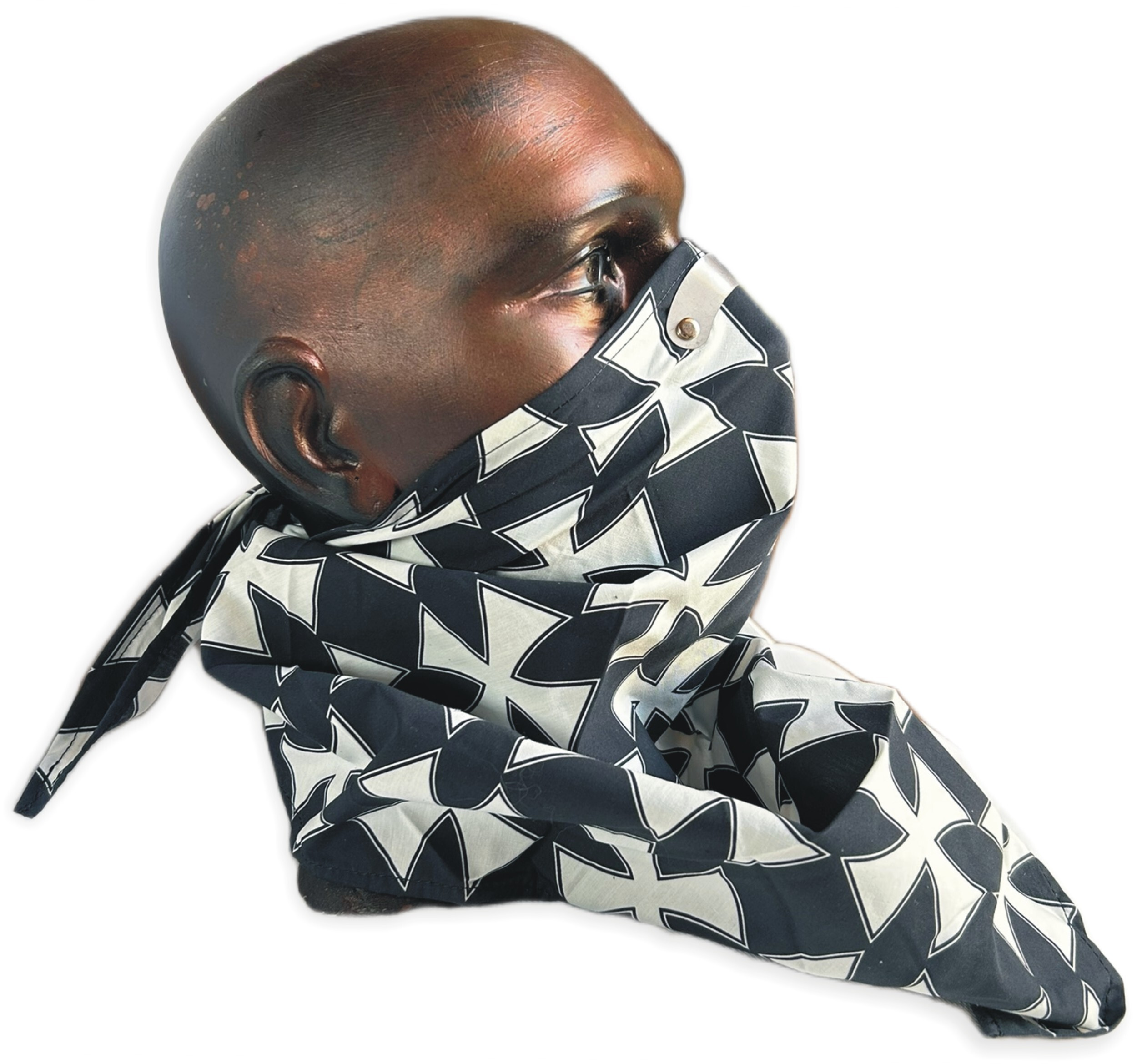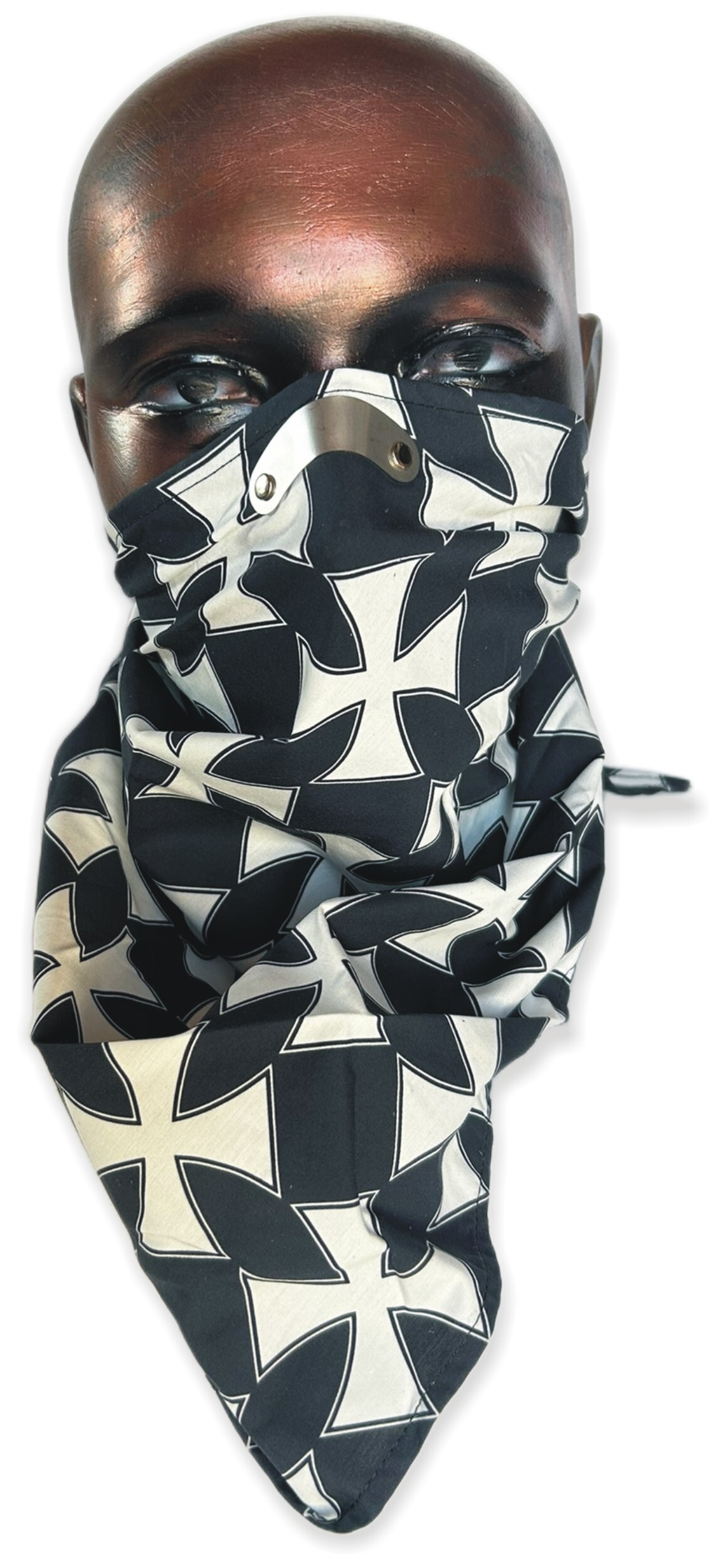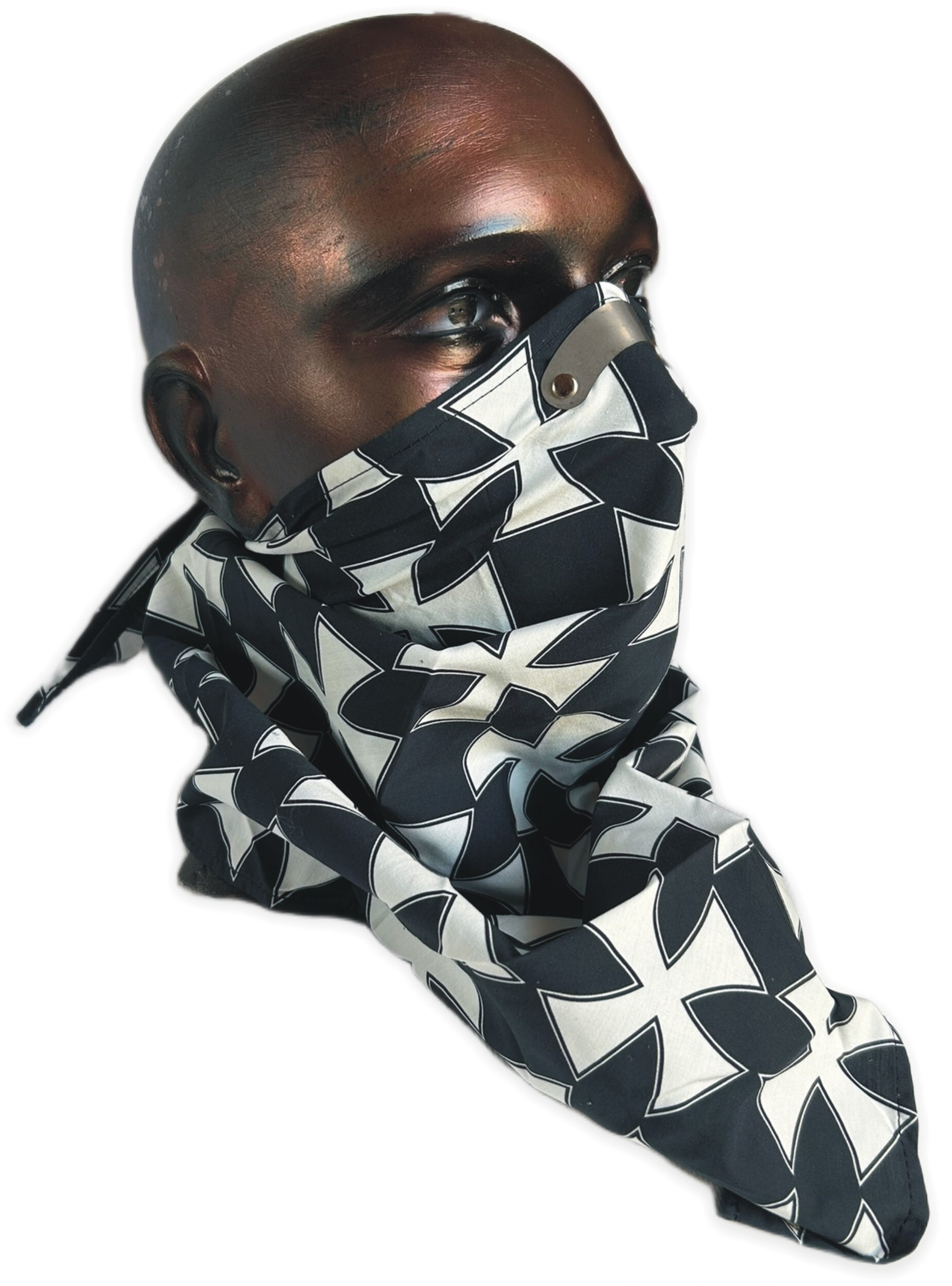 Velký trojúhelníkový šátek s kovovým skřipcem na nos a s jedinečným motivem. Díky kovovému skřipci, který lze vytvarovat podle tvaru nosu, šátek drží na obličeji i při vyšších rychlostech. Díky materiálu a technologii tisku je prodyšný, ale přitom chrání obličej před větrem, hmyzem ap. Šátek na obličej/hlavu upevňujeme zavázáním cípů šátku. Vhodný doplněk k otevřeným helmám.