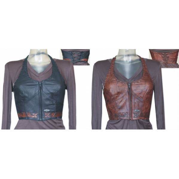 Stylový kožený top/korzet/vesta zdobený ručně raženými motivy a výšivkami, vepředu zapínání na zip, vzadu šněrování.