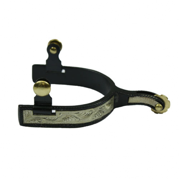 Popis výrobku western show ostruhy 5028Westernové ostruhy s malým, tupým kolečkem, ostruhy jsou po stranách zdobeny stříbrným, květinovým gravírováním. Materiál: černý kov Barva: černá/stříbrné aplikace