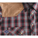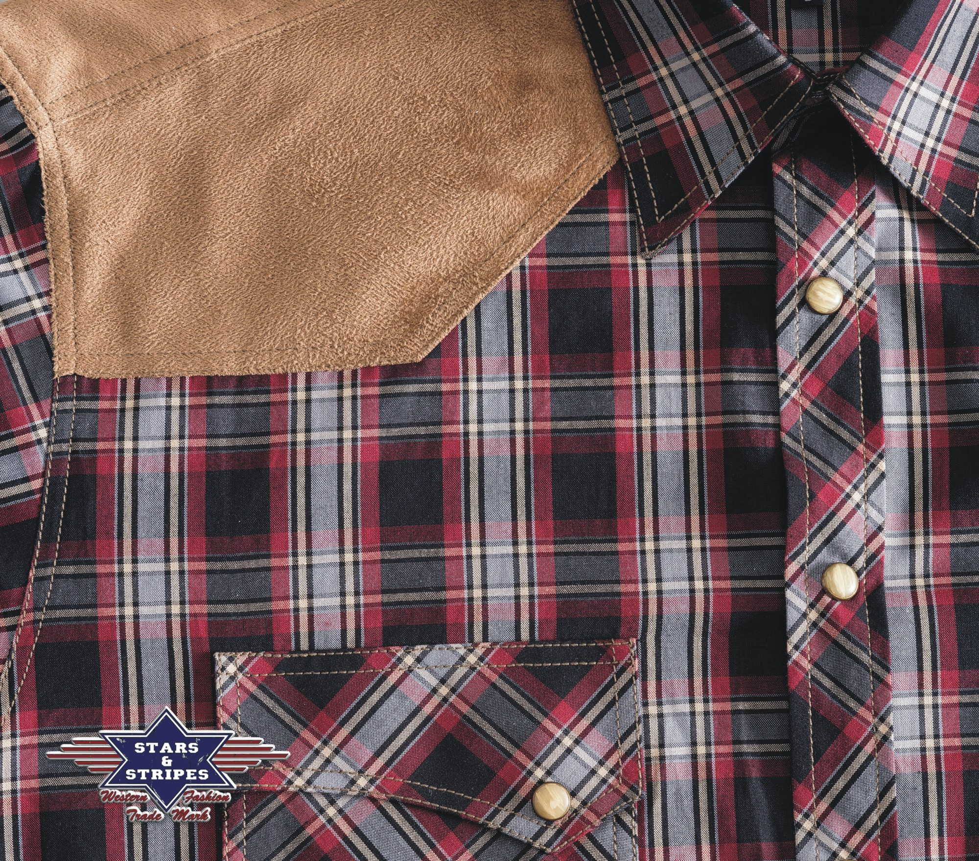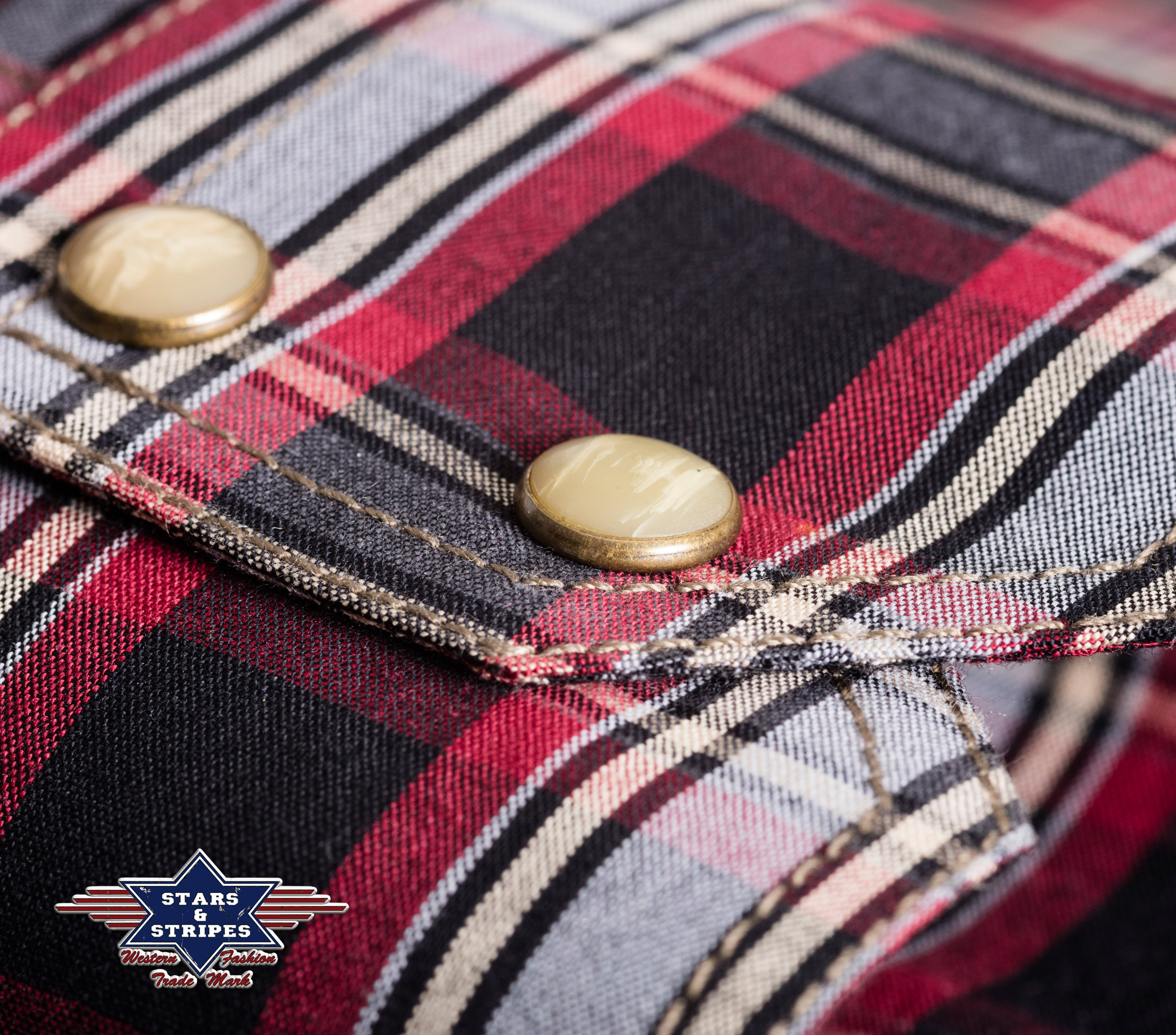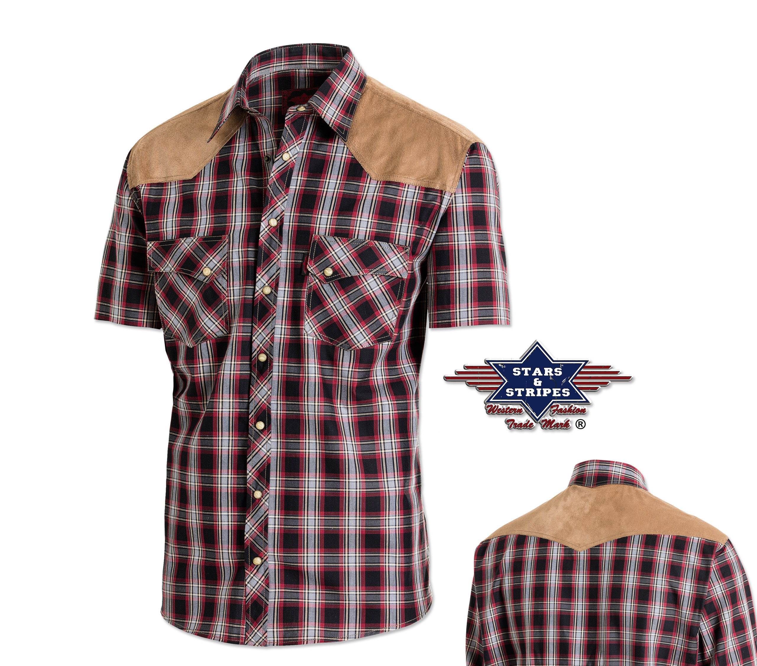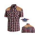 Lehká westernová košile s krátkým rukávem a kontrastními rameny vzhledově připomínající kůži. Zapínání na druky.