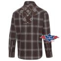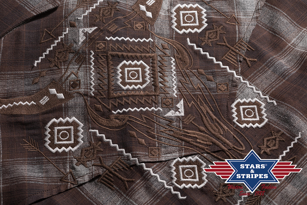 Stylová karovaná westernová košile s aztéckými výšivkami vepředu i vzadu. Náprsní kapsy, westernové sedlo a elegantní druky uhranou každého milovníka westernové módy.