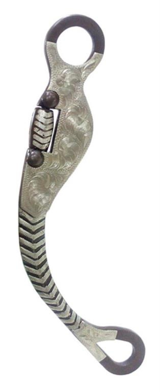 Westernové pákové udidlo zdobené stříbrným gravírováním, s plochým náustkem a s měděnými válečky.