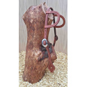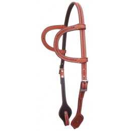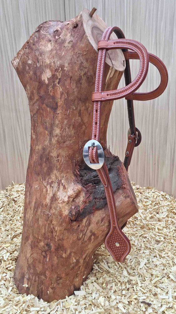 Kožená uzdečka na dvě uši zdobená basketem a nerezovými přezkami. Podšitá jemnou telecí kůží, ozdobné prošití po obvodu.