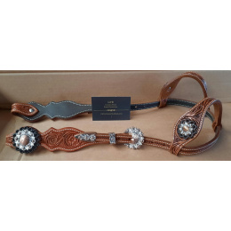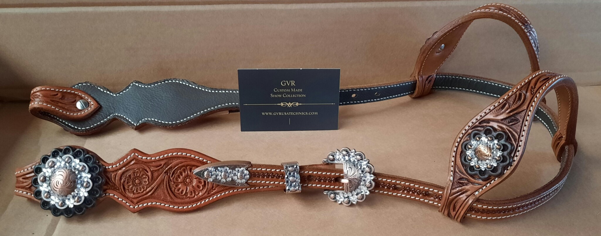Kožená show uzdečka na dvě uši antik vzhledu zdobená květinovým vzorem, přezky a končaky "Copper white", končak podložen kontrastní podložkou. Podšitá jemnou telecí kůží, ozdobné prošití po obvodu.