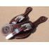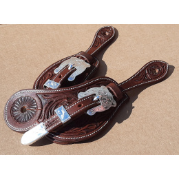 Westernové kožené řemínky k ostruhám z vysokojakostní kůže zdobené květinovým vzorem, obšité a podložené telecí kůží. Ozdobná stříbrná přezka "Gallup".