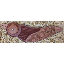 Westernové kožené řemínky k ostruhám "Wickett & Craig" zdobené květinovým motivem, basketem a koženým končakem, obšité a podložené telecí kůží. Dobytkářská značka v provedení "holubí křídlo" a se dvěma barevnými odstíny. Nerezové kování.