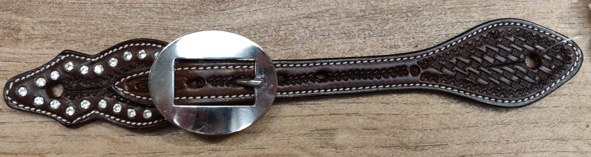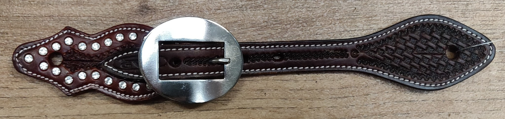 Westernové kožené řemínky k ostruhám z vysokojakostní kůže zdobené basketem a bílými kamínky, obšité a podložené telecí kůží. Nerezové kování.