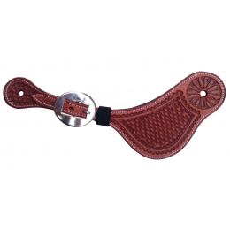 Westernové kožené řemínky k ostruhám z vysokojakostní kůže zdobené jemným basketem, obšité a podložené telecí kůží. Nerezové kování.