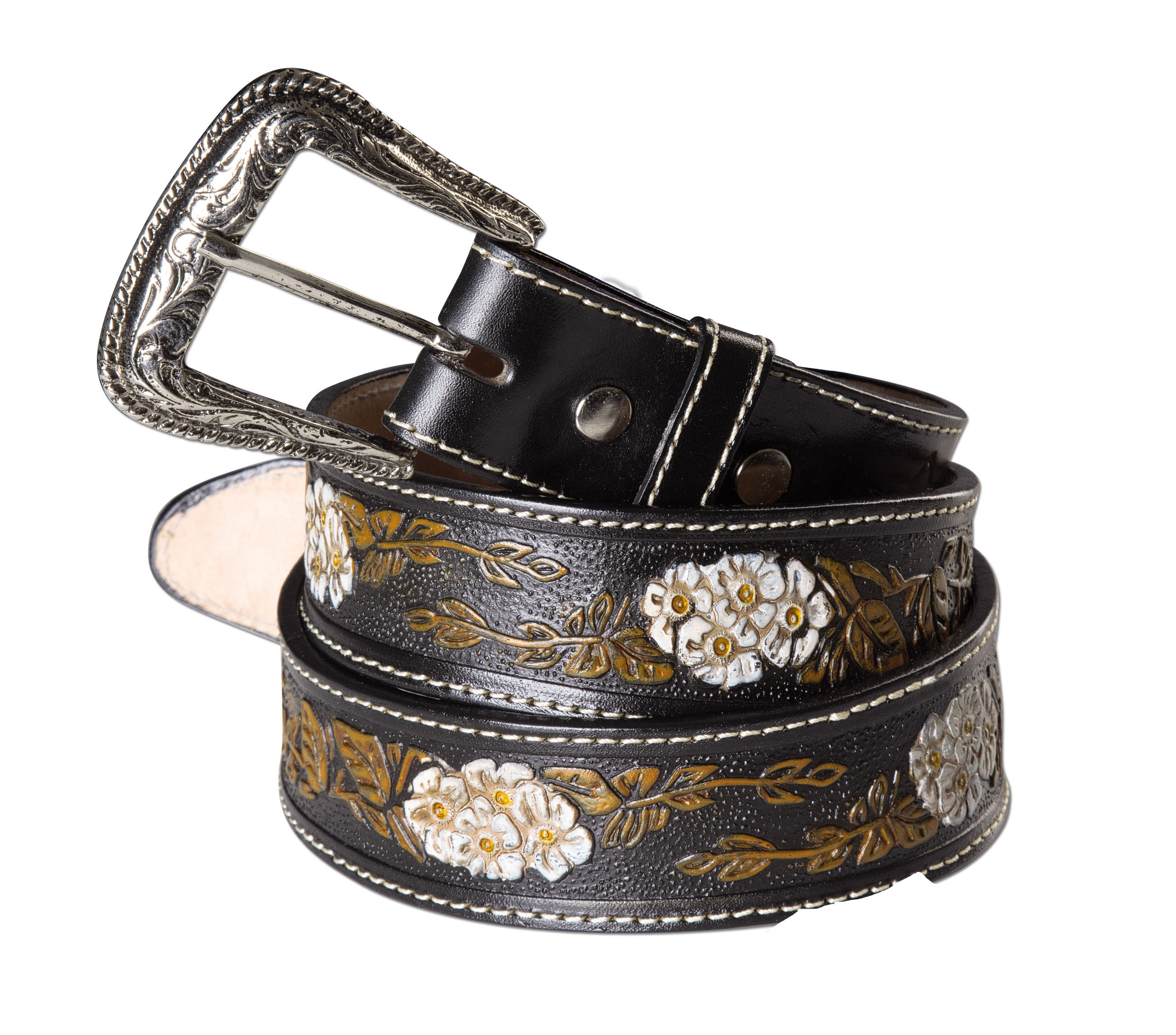 Robustní kožený westernový opasek se zdobením a výměnitelnou přezkou.
