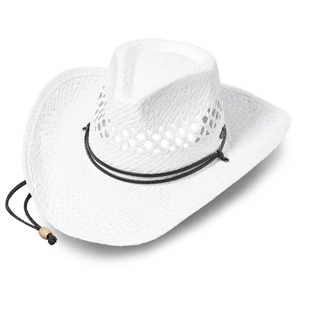 Klasický westernový klobouk s efektní děrovanou vazbou, ve výrazné bílé barvě zvýrazněný propracovaným ozdobným řemínkem. Klobouk je tvarově a rozměrově stabilní, uvnitř opatřen páskem pro nastavení velikosti.