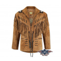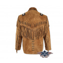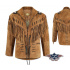 Stylová westernová bunda z drásané kůže s ozdobnou nášivkou na ramenou a jednou vnitřní kapsou. Třásně vepředu, vzadu i na rukávech.