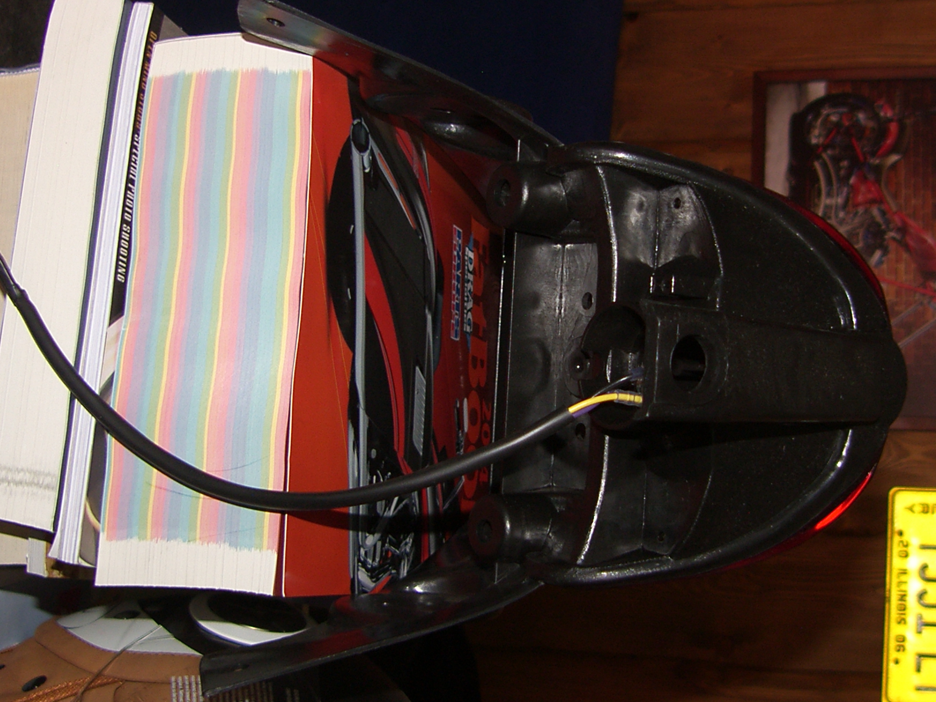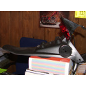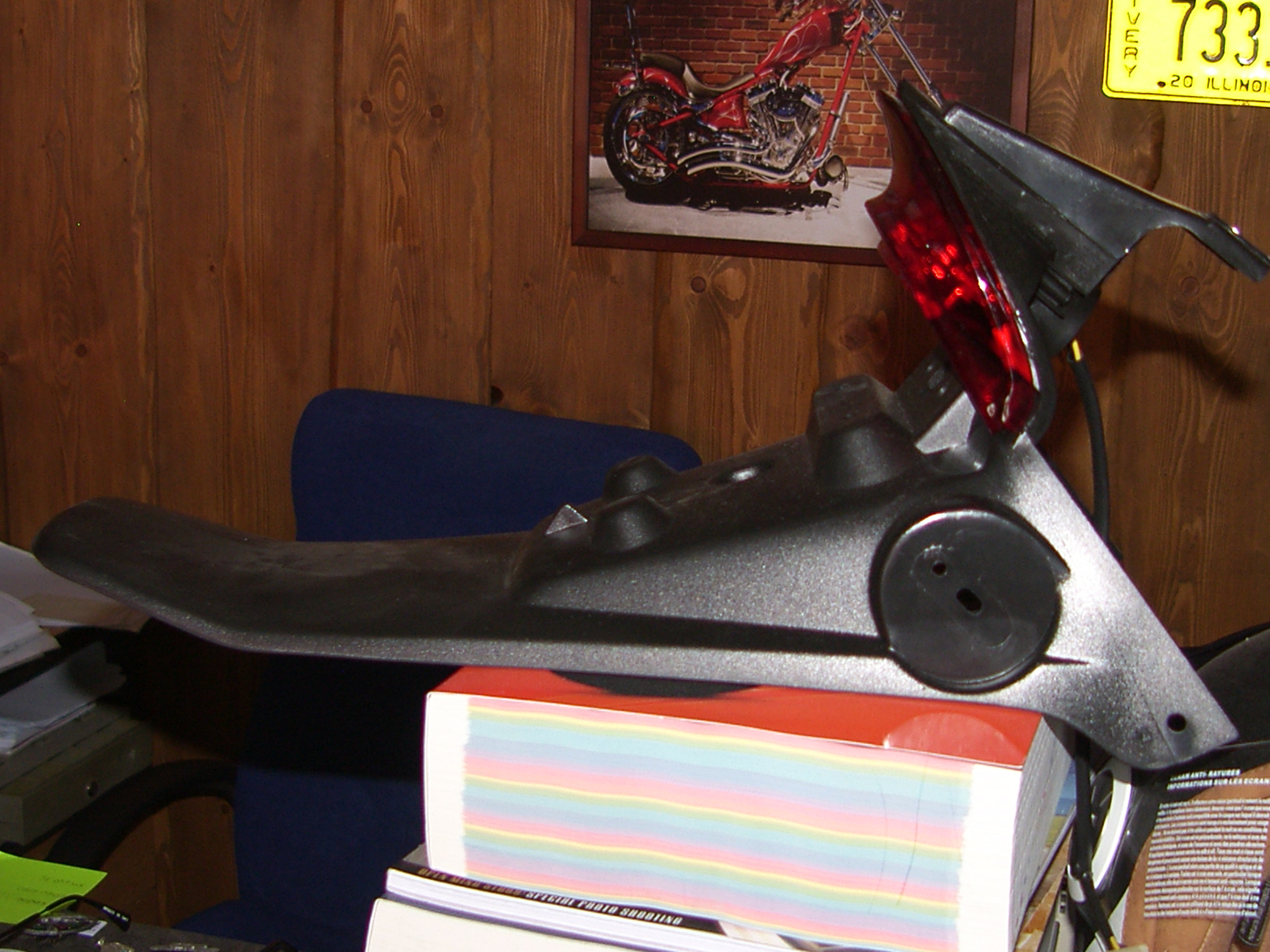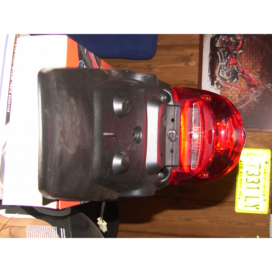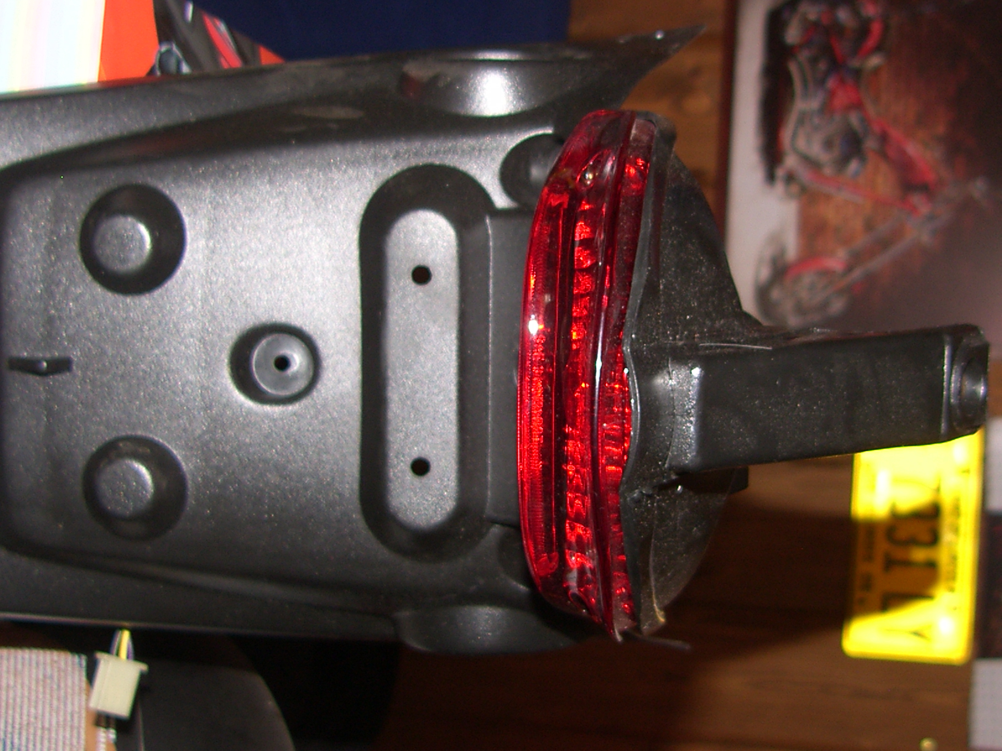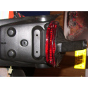 Umělohmotný zadní blatník se světlem (zadní červené světlo, bílé osvětlení SPZ) na skůtr (neznám typ ani výrobce), včetně přizpůsobení pro umístění SPZ.