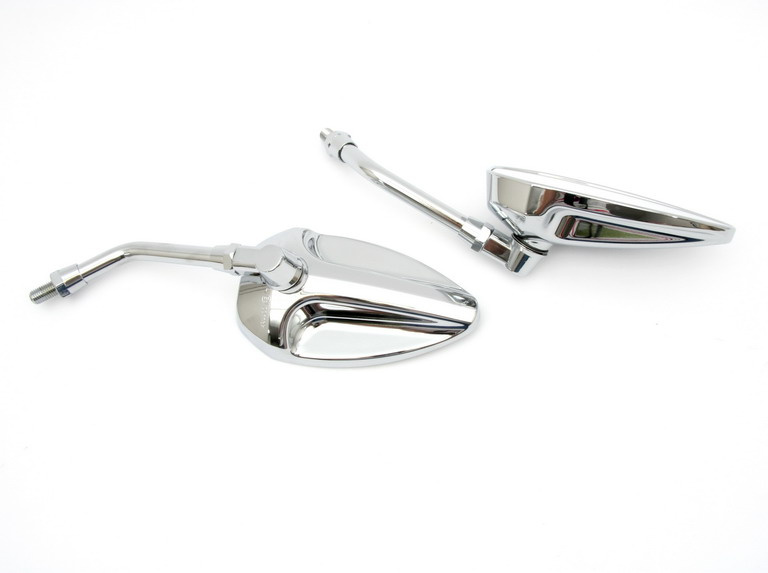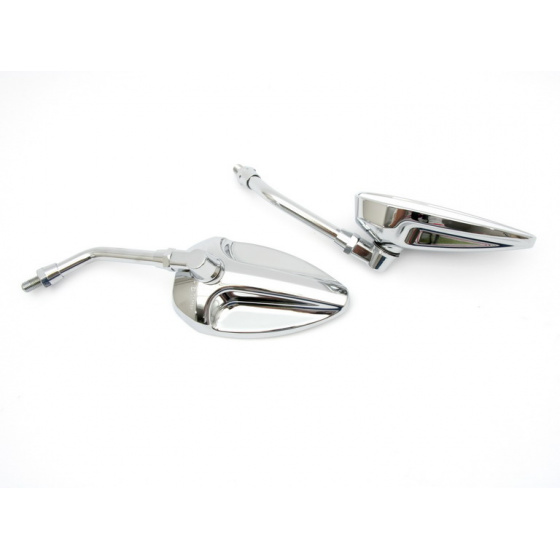 Zpětná zrcátka Mr.T, oválný tvar zrcátka, oboustranné. Určeno pro montáž na všechny typy japonských motocyklů kromě Yamahy. Pro levou i pravou stranu (na Yamahy pouze pro levou stranu). Zrcátka mají evropskou homologaci.