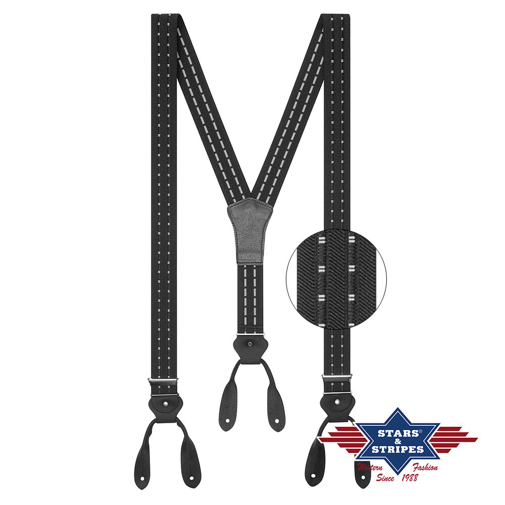 Kšandy s koženými sponami na připevnění ke kalhotám pomocí knoflíků. Typ "Y".