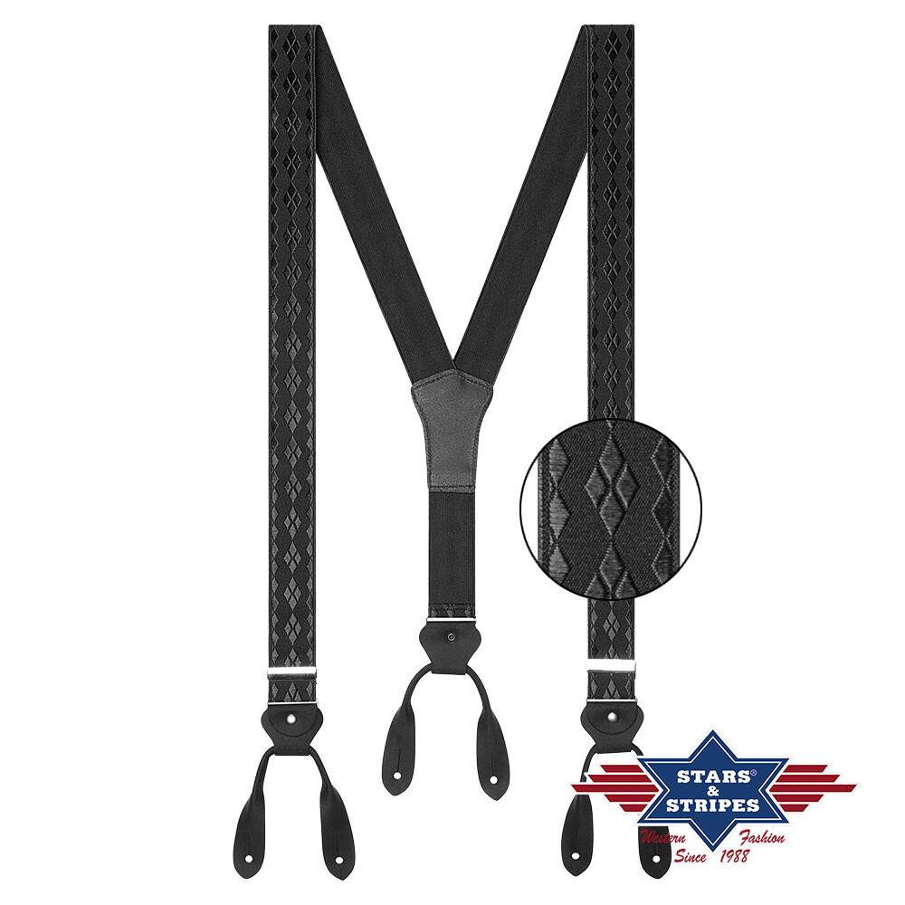 Kšandy s koženými sponami na připevnění ke kalhotám pomocí knoflíků. Typ "Y".