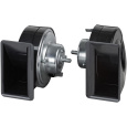 Černá elektromagnetická dvojitá fanfára šnekového tvaru pro motocykly chopper a cruiser.