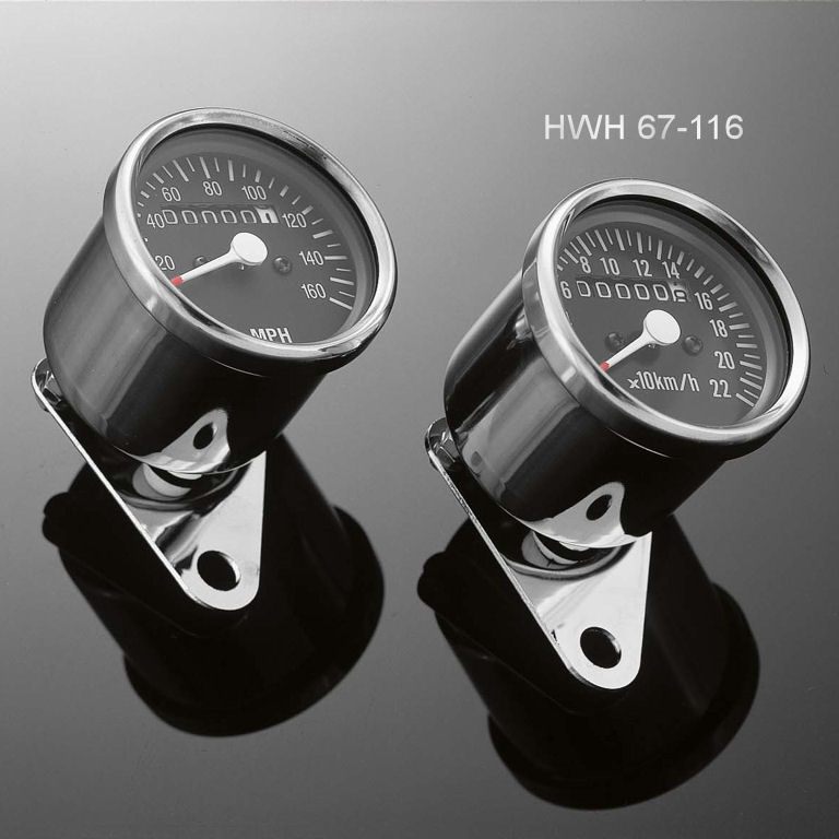 Tachometr s držákem, průměr 60 mm, koeficient 2:1, Km/h, mechanický, černý nebo bílý (!!!POZOR!!!! bílý i s denním počítadlem a kontrolkami) ciferník, materiál: ocel, povrchová úprava: chrom.