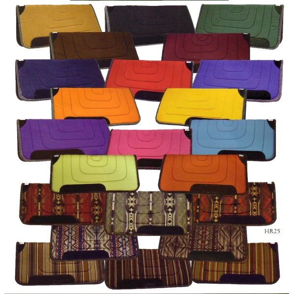 Rancher podložky-podsedlové deky jsou vynikající při srovnání ceny a kvality a jsou nejprodávanější. Jsou vyrobeny z jeden palec silné vlněné plsti, prošité silnou bavlněnou látkou, zpevněné semišovou kůží. Vyrobeno v jednobarevných odstínech, nebo westernových vzorech.