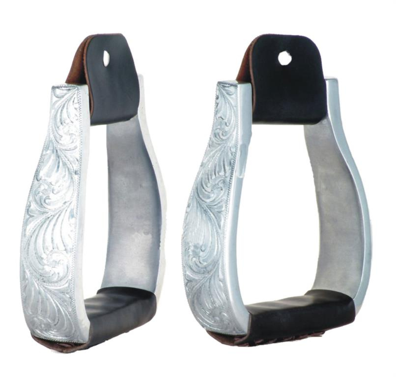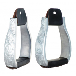 Zdobené hliníkové třmeny s koženými nášlapy, ručně ryté zdobení.