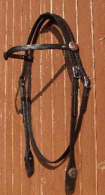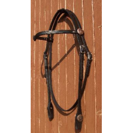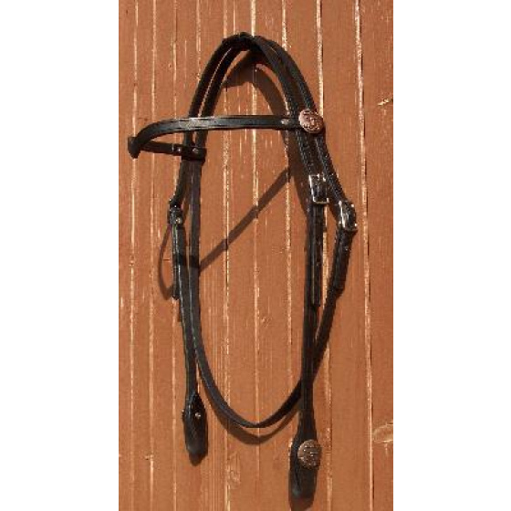 Kožená uzdečka s čelenkou do V zdobená drážkou a končem (kulaté s hvězdou), cena obsahuje i podbradní řemínek.