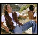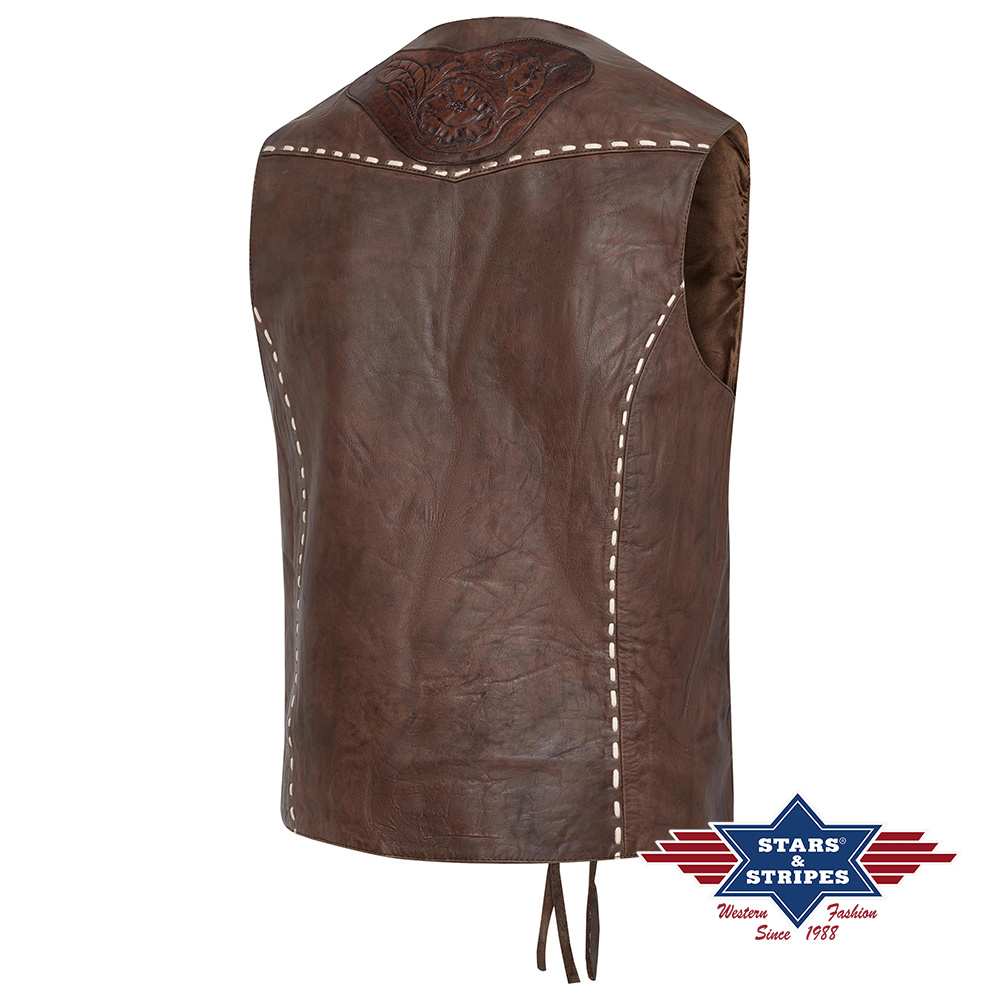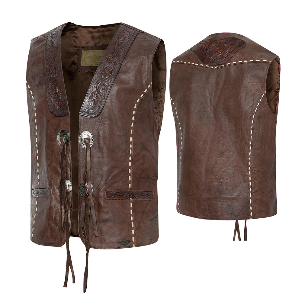 Vesta z jemné kůže, švy prošité světlou koženou nití, zdobená ručně raženými vzory a conchas. Dvě vnější a jedna vnitřní kapsa.