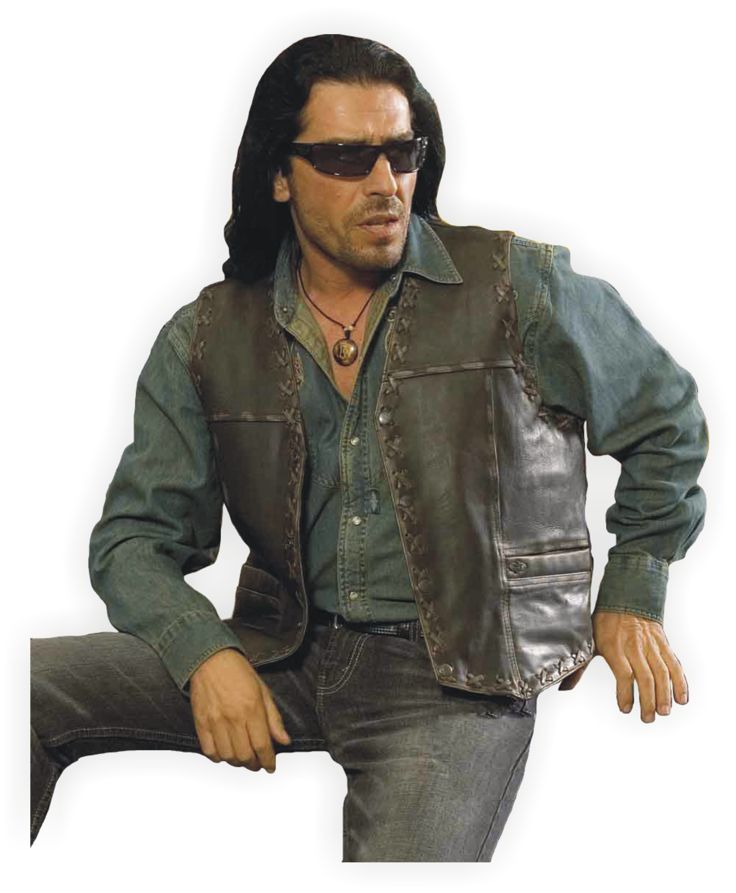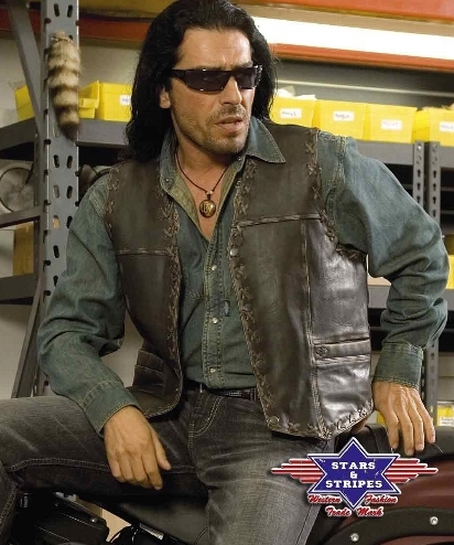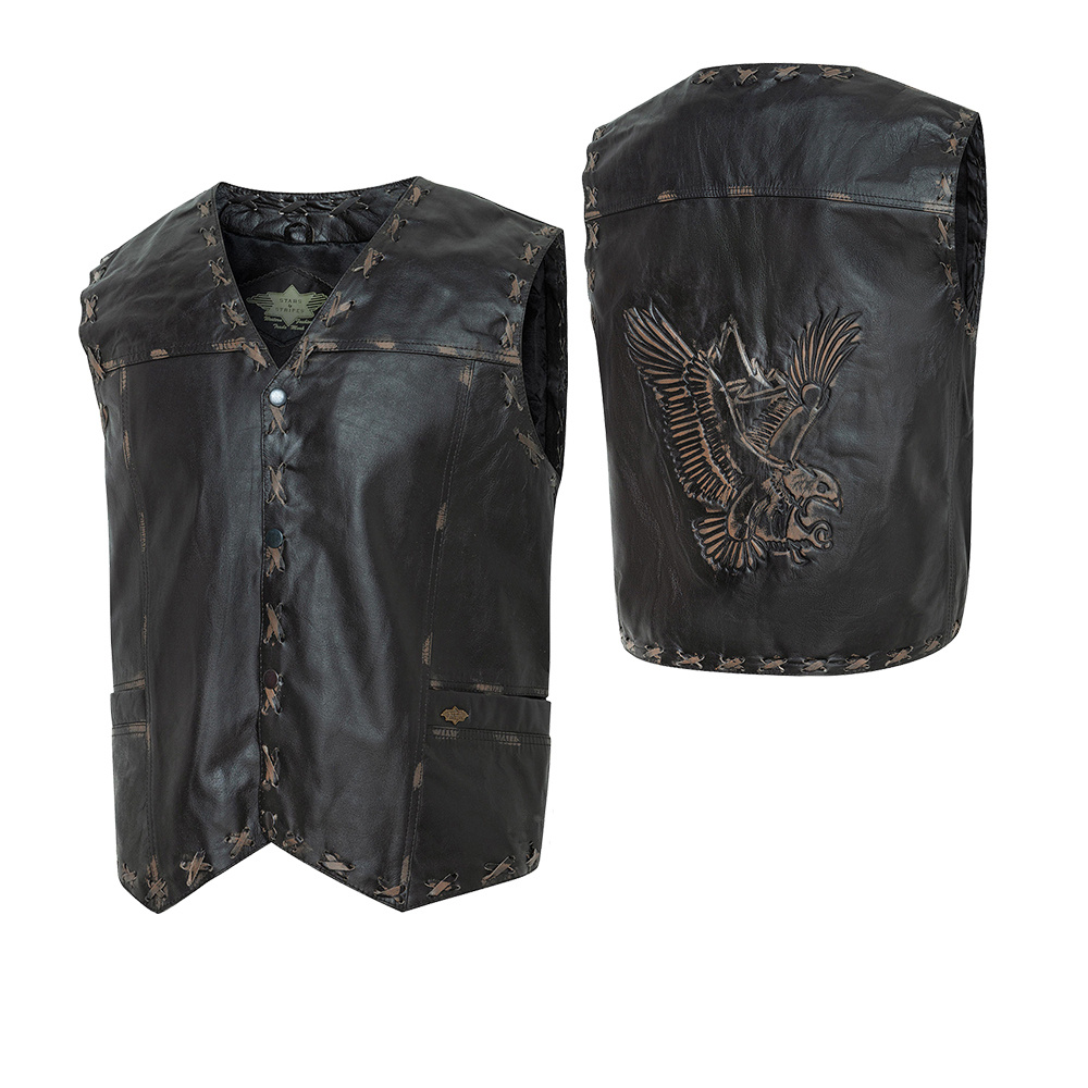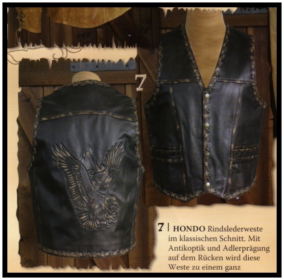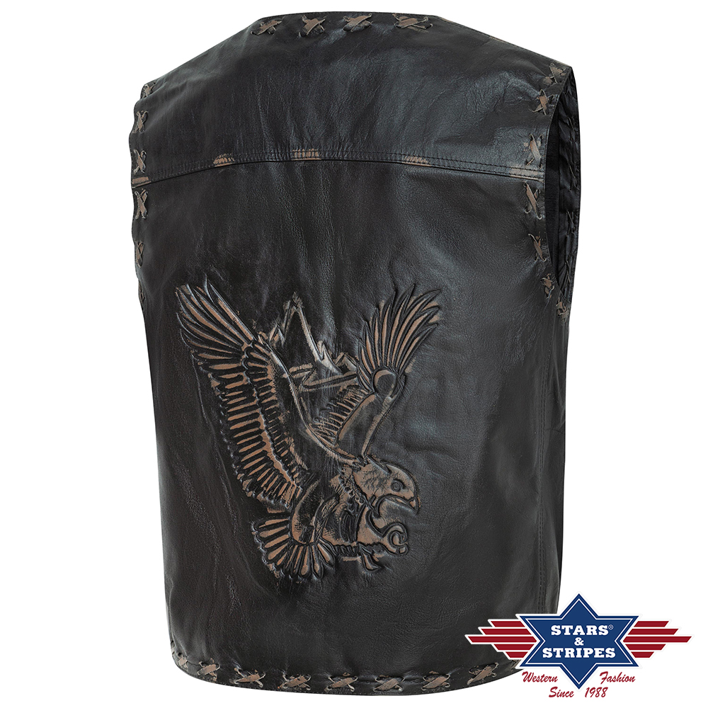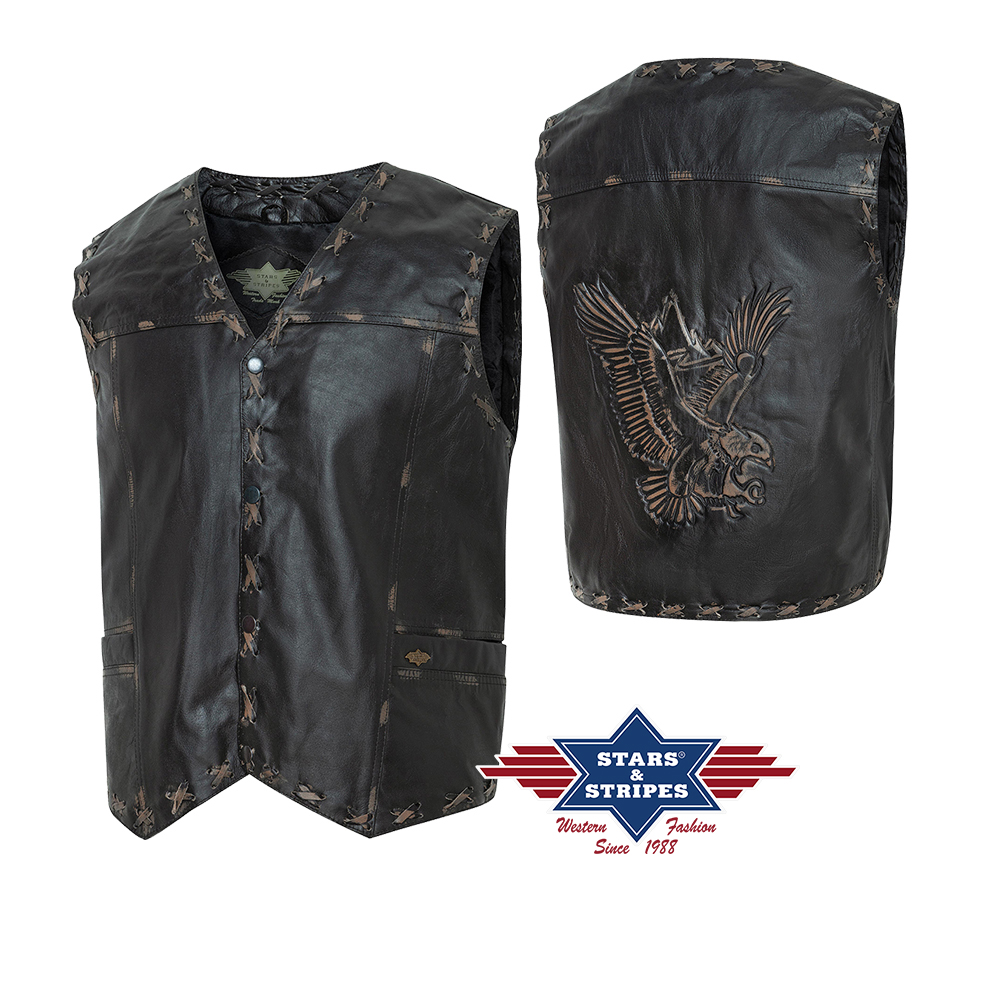 Vesta z hověziny se zastaralým vzhledem, s dekorativními švy s křížovým stehem a vyraženým orlem na zádech. Dvě vnější a jedna vnitřní kapsa.