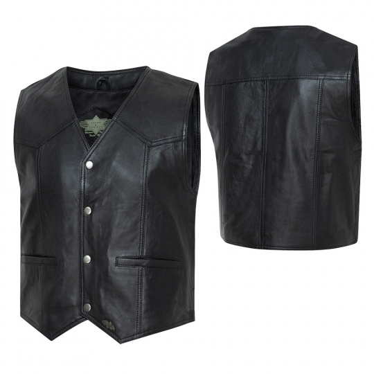 Pánská vesta vyrobená z kvalitní hladké kůže. Dvě vnější a jedna vnitřní kapsa.