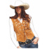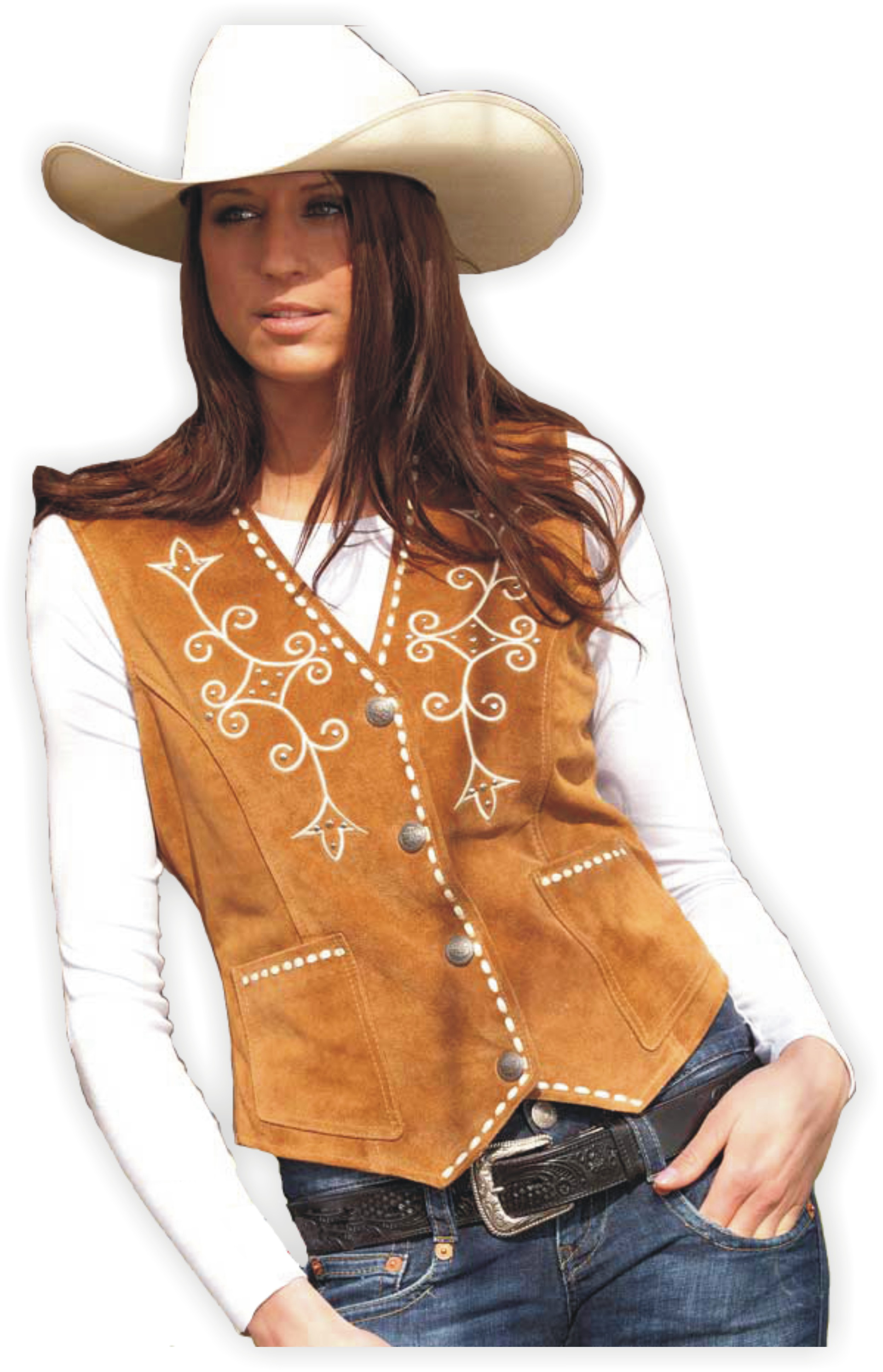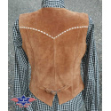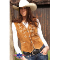 Dámská vesta vyrobená z nejkvalitnější hovězí kůže. Jezdobená kontrastním vyšíváním na prsou a obšitím švů, velkými knoflíky a kapsami.