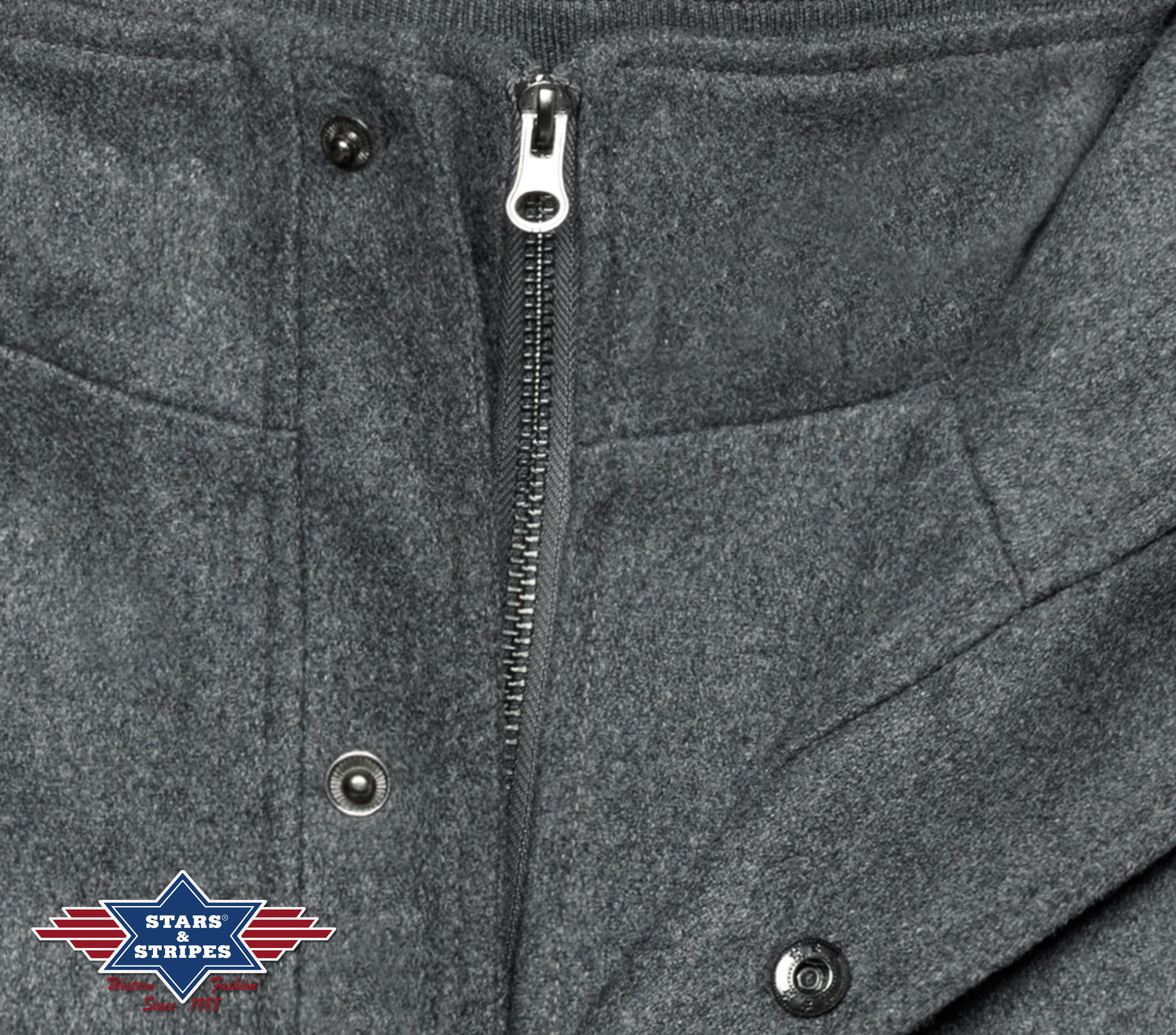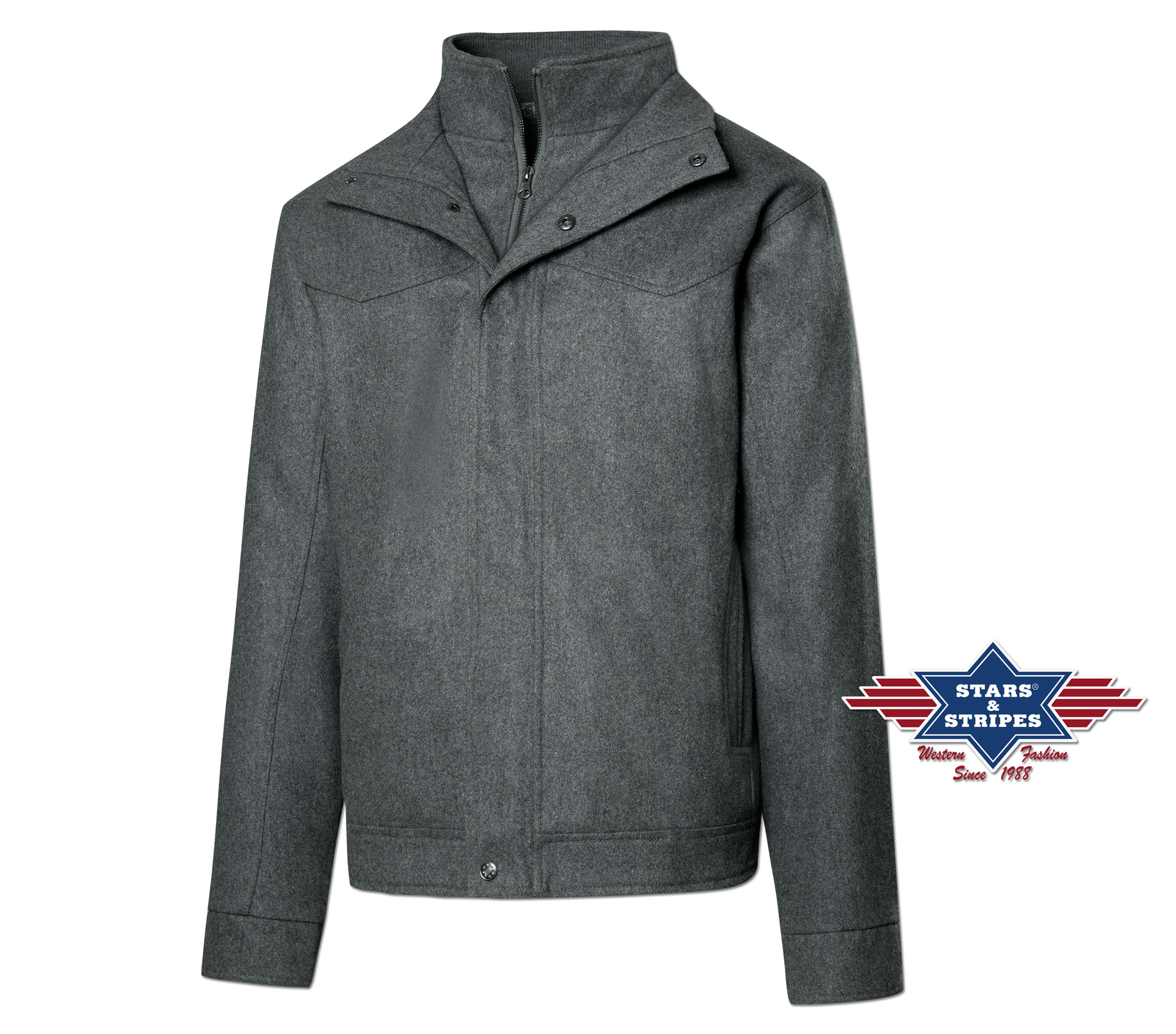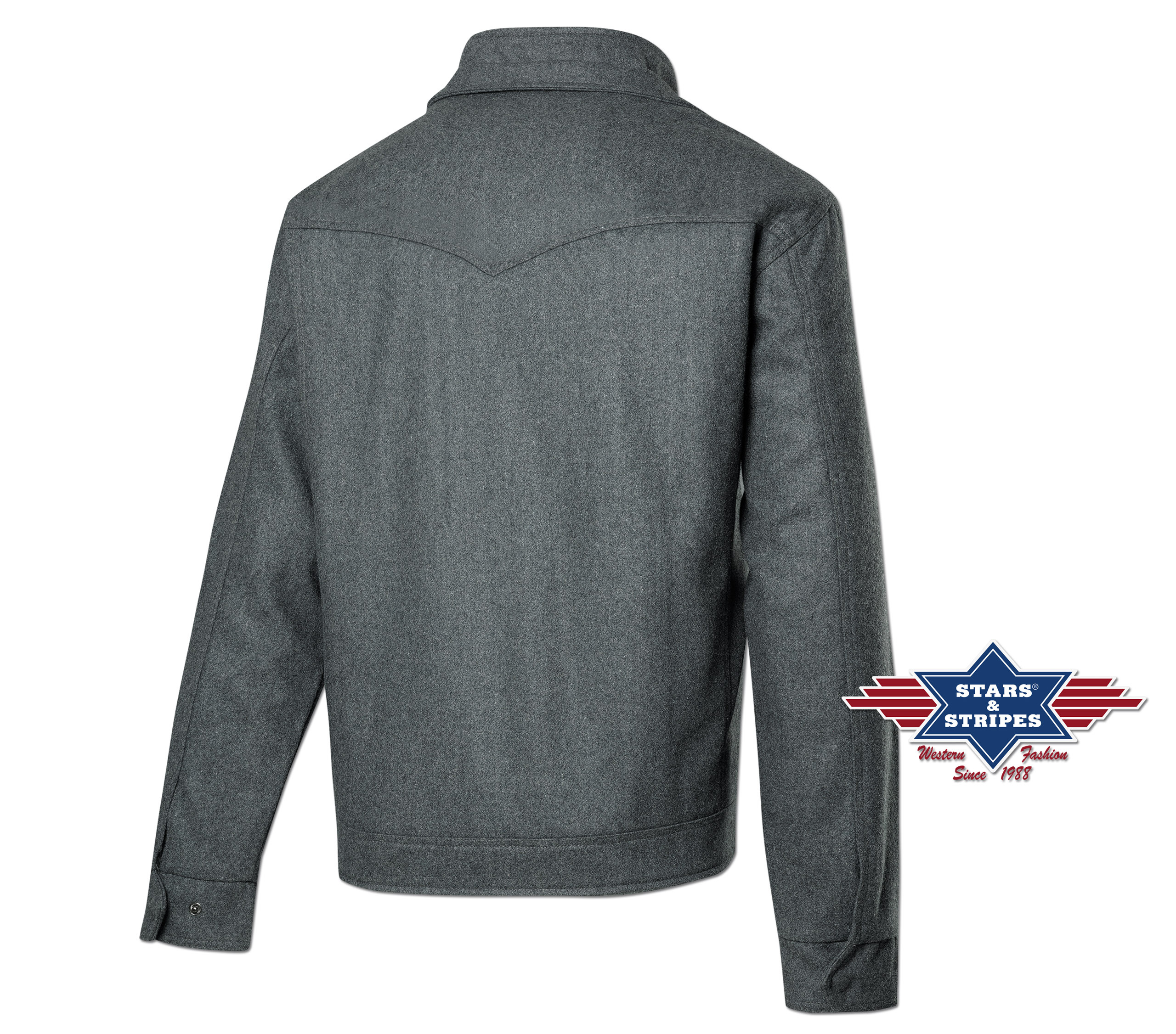 Stylová vlněná bunda s westernovým sedlem. Dvě vnitřní kapsy, dvě vnější kapsy a zip zakrytý klopou s druky.