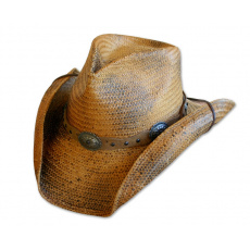 Stylový, tvarově stálý slaměný westernový klobouk s ozdobným sisalovým řemínkem po obvodu. Na hlavě