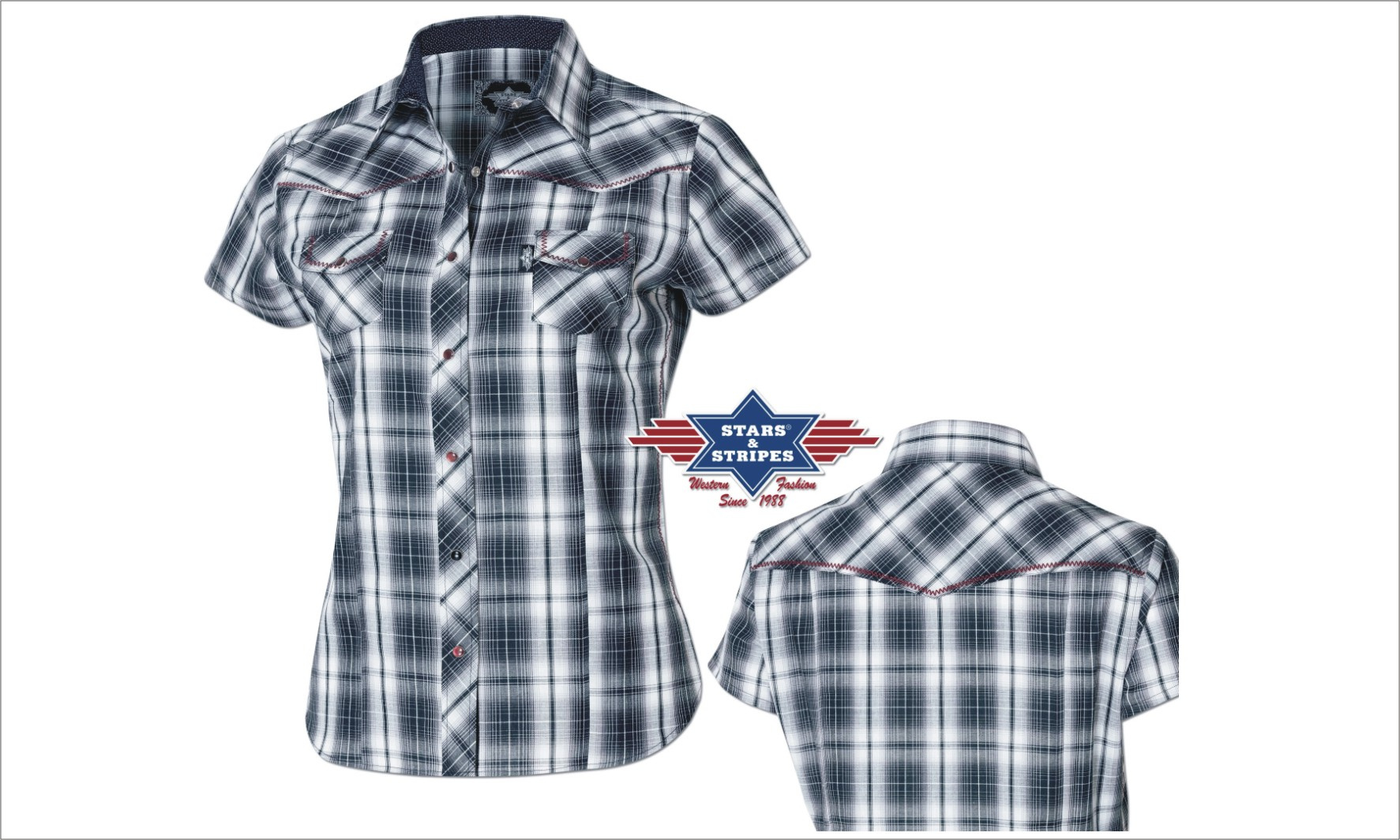 Kostkovaná dámská košile s westernovým sedlem v barevně kontrastním provedení a s výšivkou. Zvýrazně