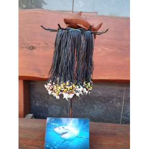 Pravá žraločí zub na šňůrce zdobené korálky.