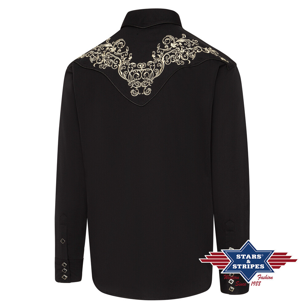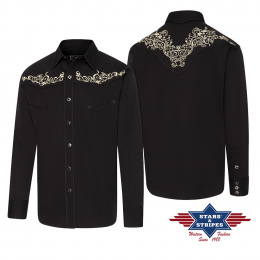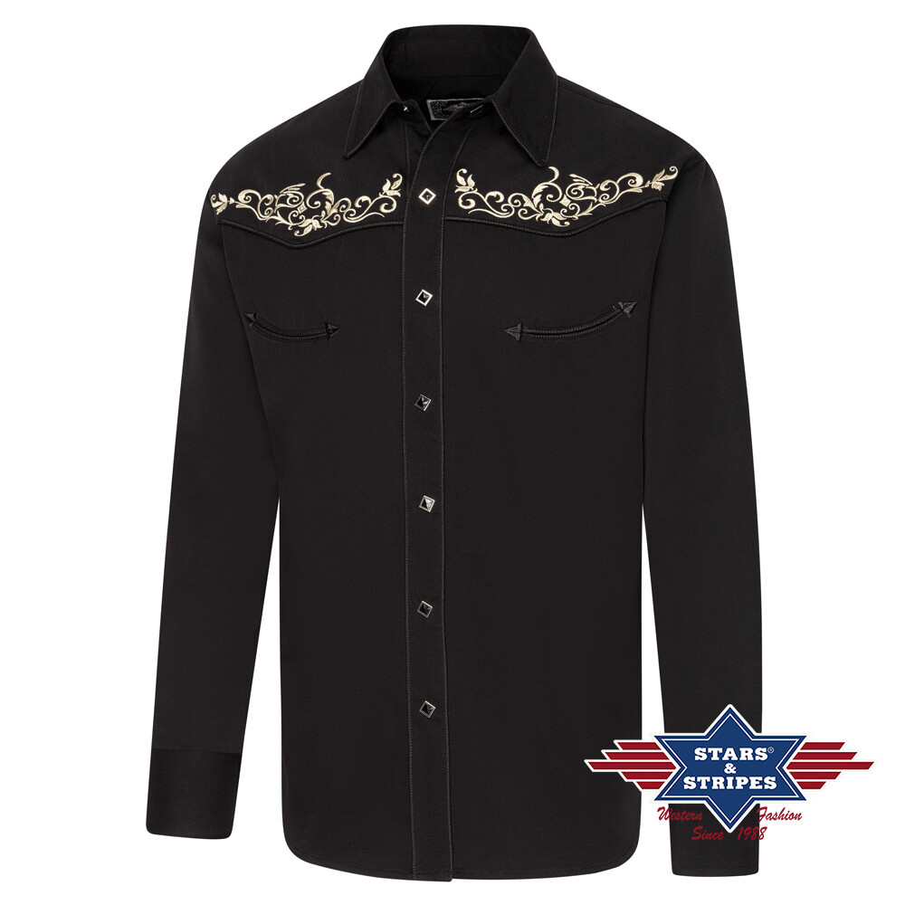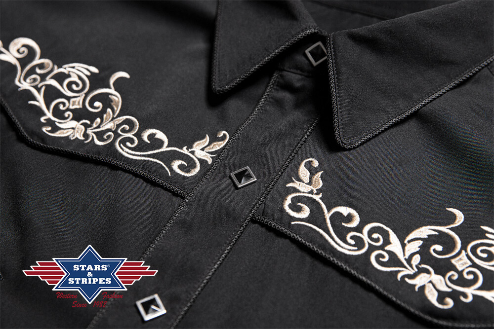 Nádherná stylová westernová košile s exkluzívní výšivkou na hrudi a zádech. Funkční náprsní kapsy a manžety s knoflíčky umocňují styl klasické westernové módy. Košile kombinuje snadno udržitelnou texturu s velmi pohodlným střihem.
