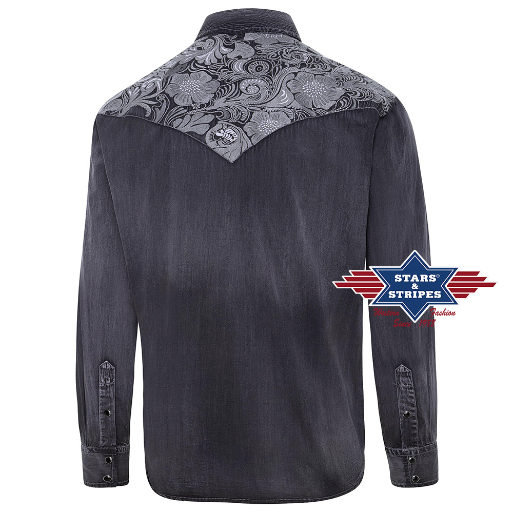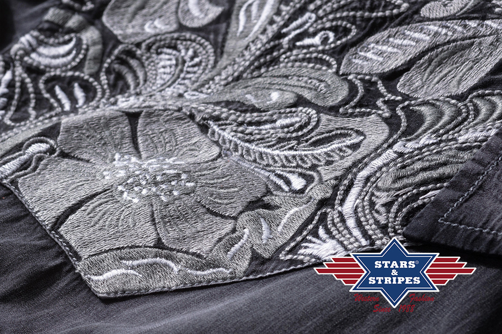 Stylová košile s patinou a s vyšívaným westernovým sedlem květinového vzoru. Košili dotváří náprsní kapsy, světlé švy a černé druky. Do páru s dámskou halenkou Wilma.