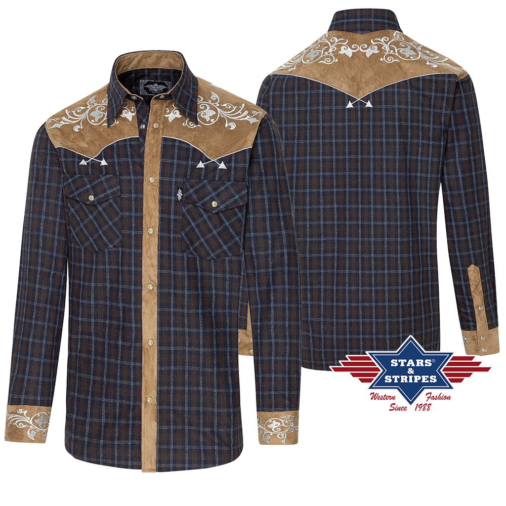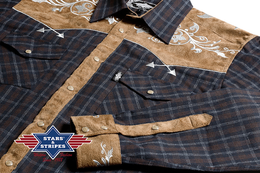 Stylová kostkovaná košile s vyšívaným westernovým sedlem květinového vzoru. Košili dotváří náprsní kapsy, lem v límci a slušivé patentky. Westernové sedlo a vyšívané manžety mají semišový vzhled.