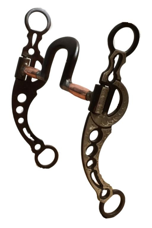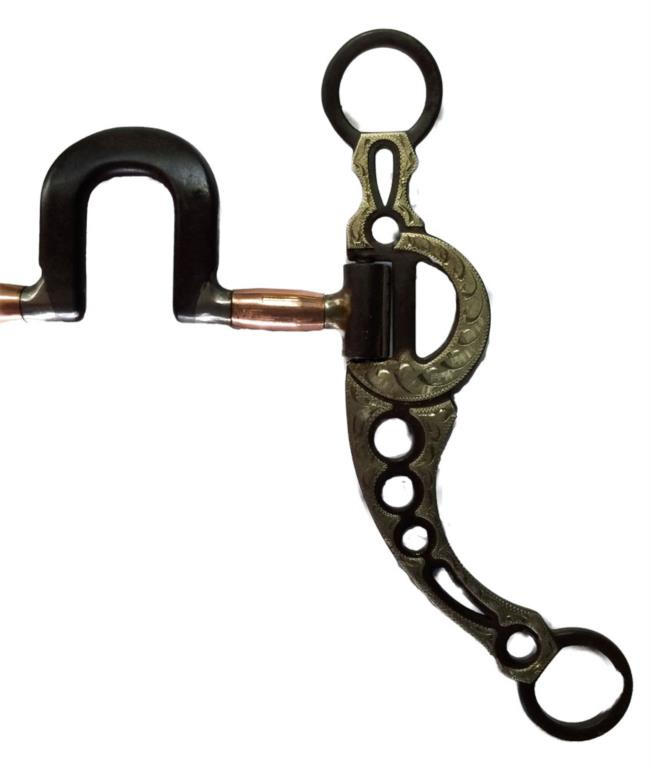 Westernové pákové udidlo zdobené stříbrným gravírováním, dlouhý plochý náustek, měděné válečky.