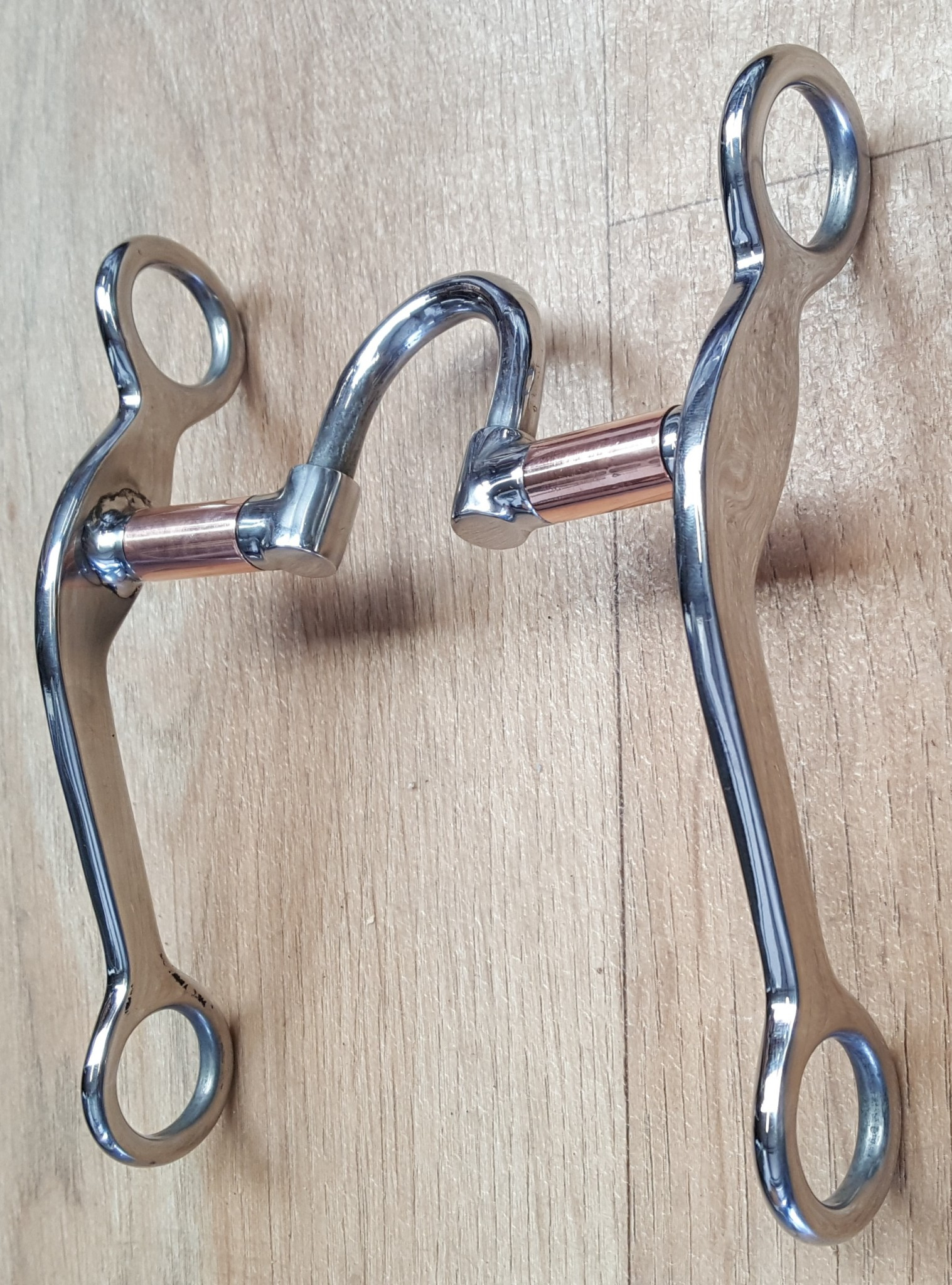 Westernové pevné korekční pákové udidlo s krátkými rameny a měděnými válečky na náustku.