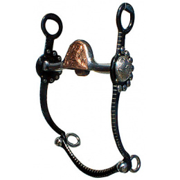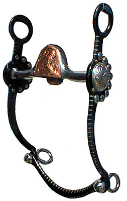 Westernové pákové udidlo ve stylu "Old Californian" zdobené končakem, pevný náustek s měděným válečkem a gravírovanou měděnou krytkou.