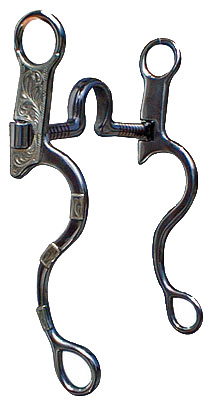Westernové pákové udidlo se zdobenými gravírovanými rameny a s měděnými proužky na náustku.