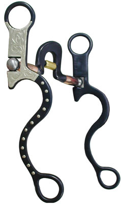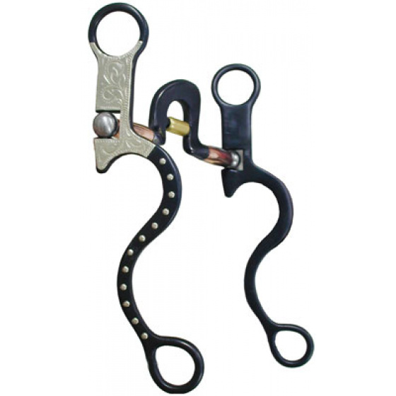 Westernové pákové udidlo se zdobenými gravírovanými rameny, náustek s vysokým portem a měděnými válečky.