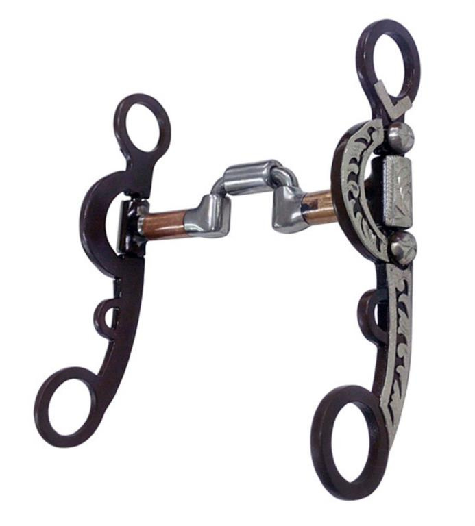 Westernové pákové udidlo zdobené stříbrným gravírováním, s nízkým válečkovým náustkem a s měděnými válečky.