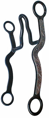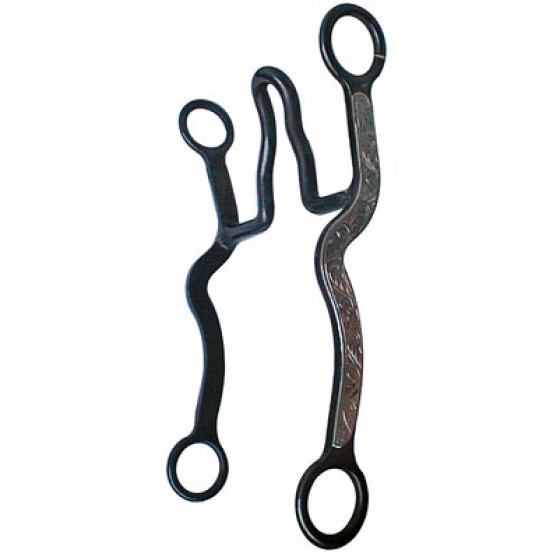 Westernové pákové udidlo s dlouhými rameny zdobené stříbrným gravírováním, náustek vykládaný měděnými proužky s vysokým portem.
