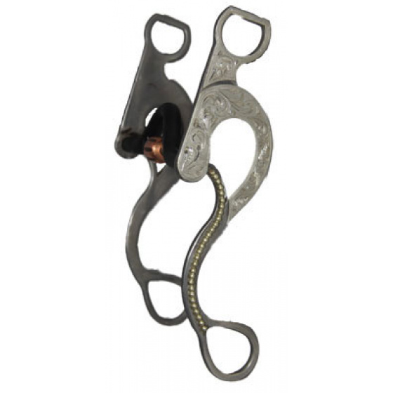 Zvedací westernové pákové udidlo se stříbrným zdobením, černý náustek s nízkým portem a měděným válečkem.