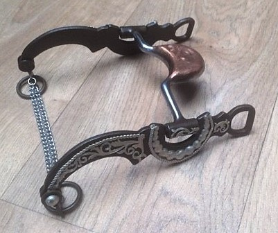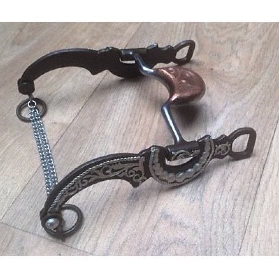 Tmavé westernové pákové udidlo zdobené stříbrným gravírováním, s měděným náustkem a řetízkem.
