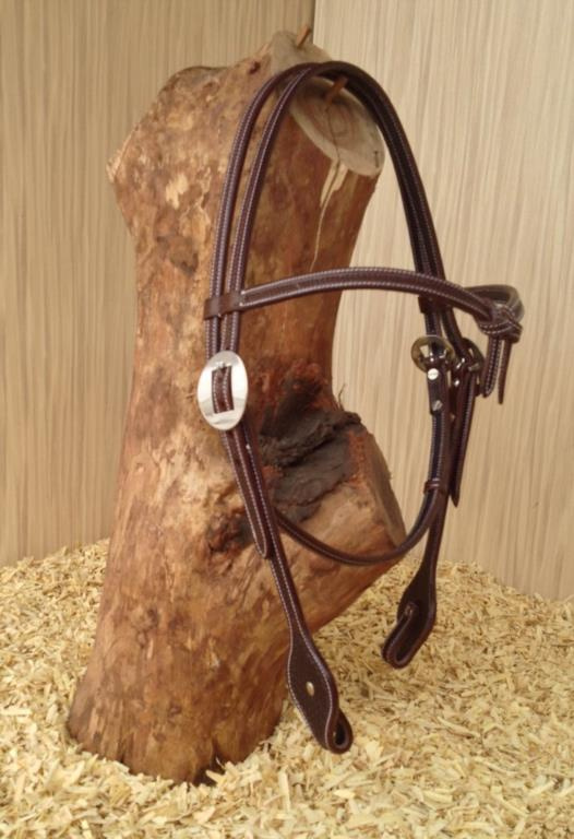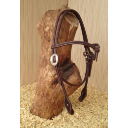 Kožená uzdečka s čelenkou zdobená jemným basketem, kování nerez. Podšitá jemnou telecí kůží, ozdobné prošití po obvodu.