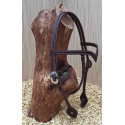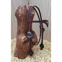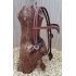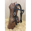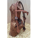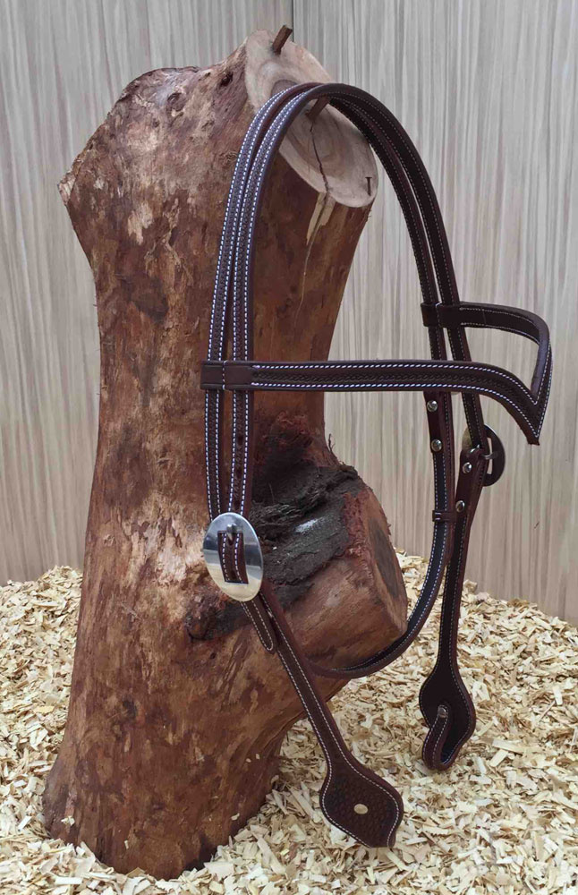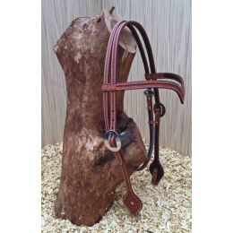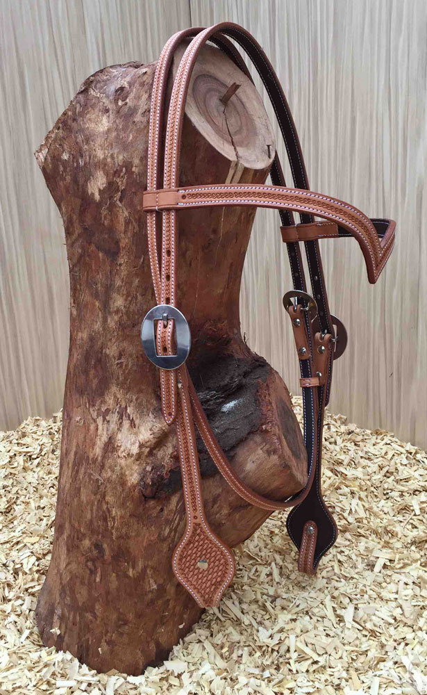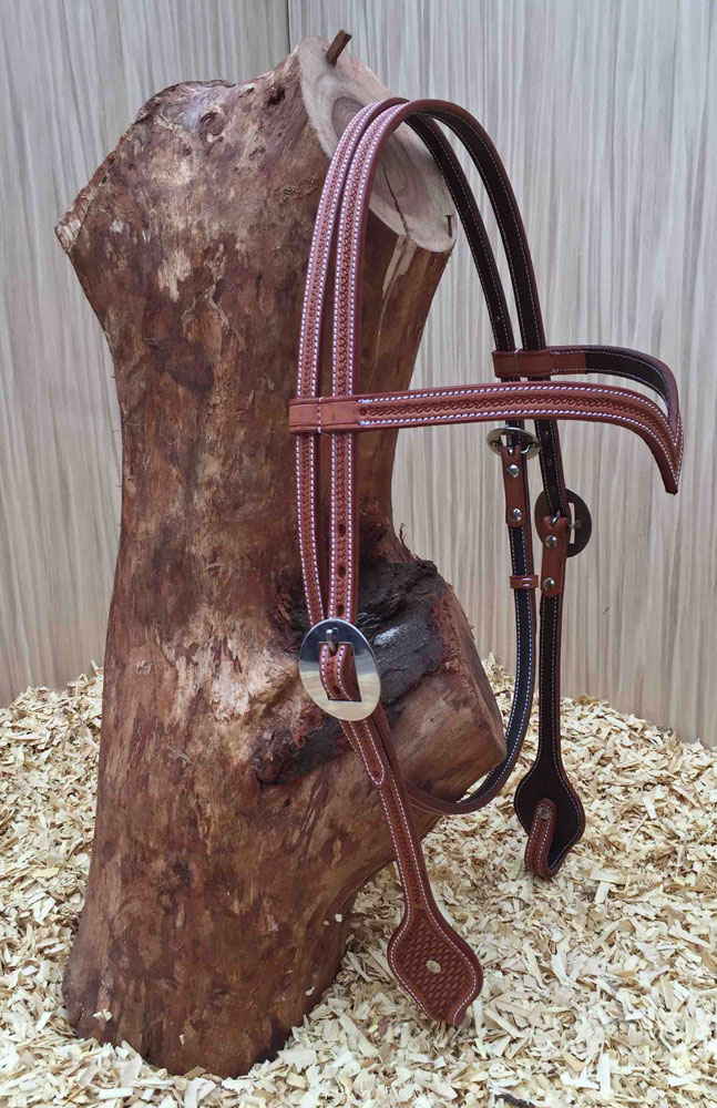 Kožená uzdečka s čelenkou do V zdobená jemným basketem, kování nerez. Podšitá jemnou telecí kůží, ozdobné prošití po obvodu.