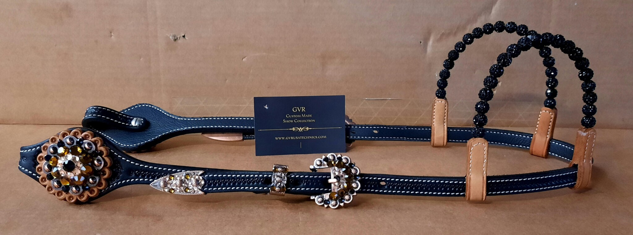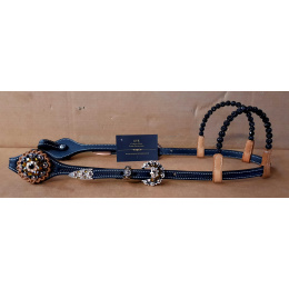 Kožená zdobená show uzdečka na dvě uši dvoubarevná, náušníky z kuliček, s končakem a přezkami "Black Tea". Podšitá jemnou telecí kůží, ozdobné prošití po obvodu.