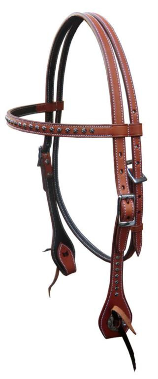 Kožená uzdečka s čelenkou zdobená nýtky a končakem. Podšitá jemnou telecí kůží, ozdobné prošití po obvodu.
