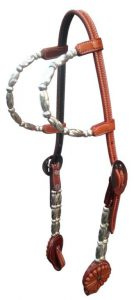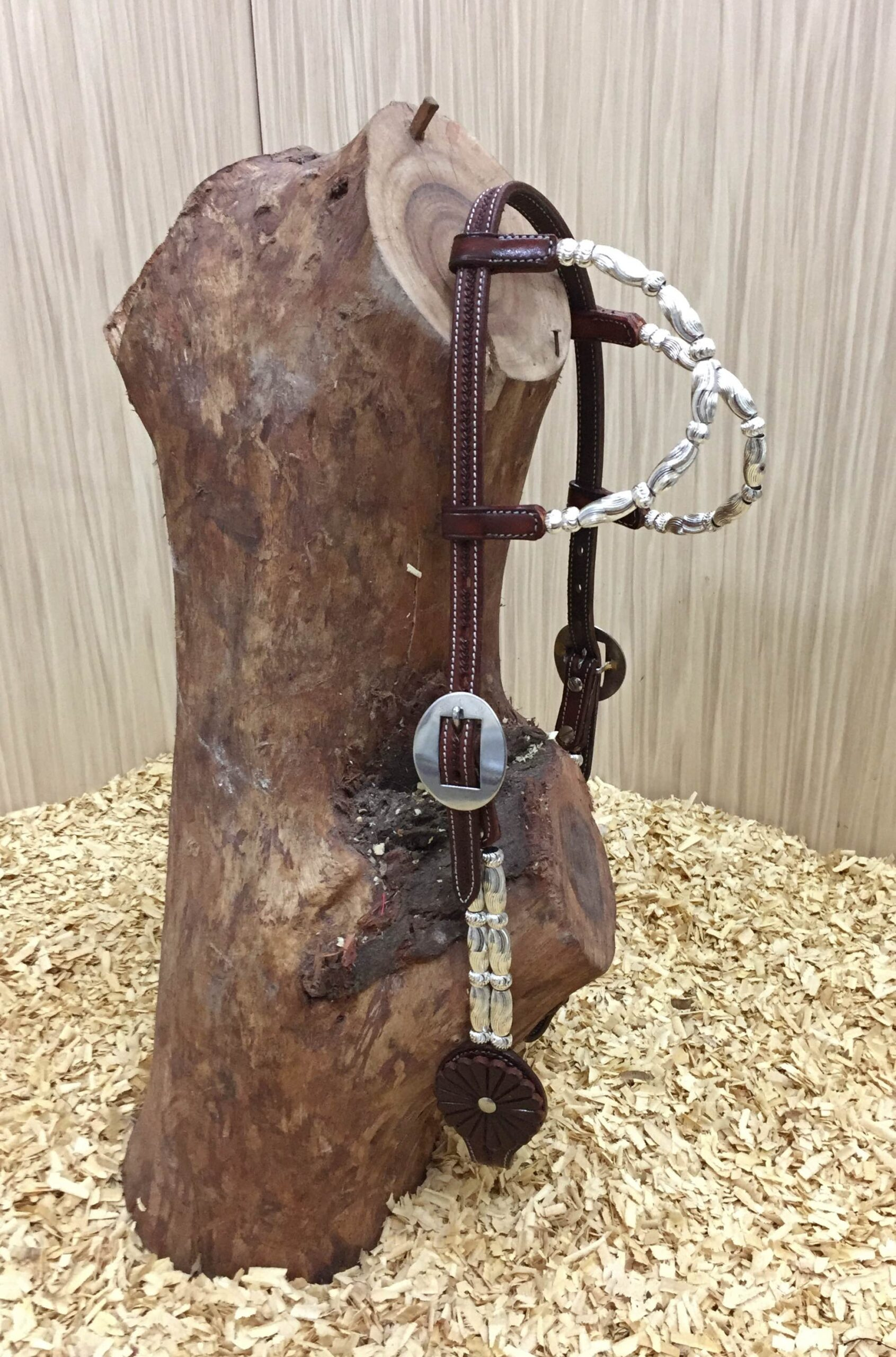 Kožená show uzdečka na dvě uši z vysoce kvalitní kůže Sadesa zdobená vytlačeným vzorem a stříbrnými válečky a kuličkami. Podšitá jemnou telecí kůží, ozdobné prošití po obvodu.